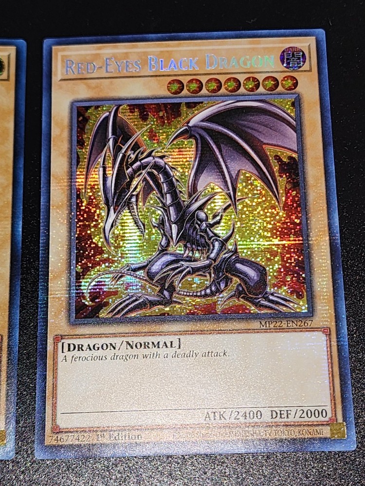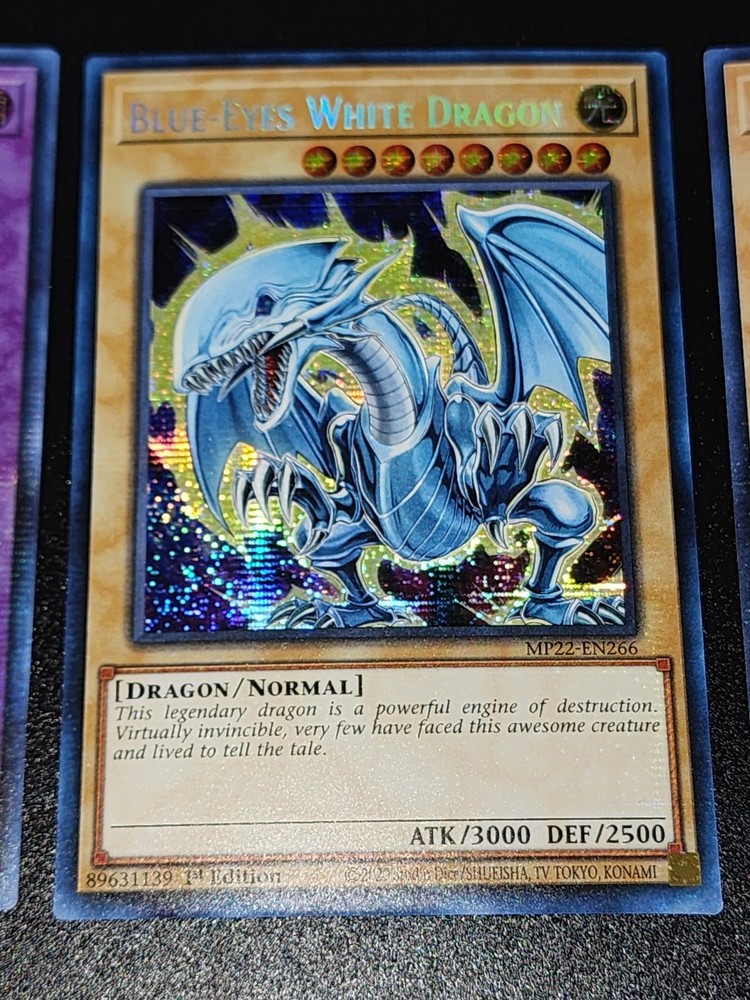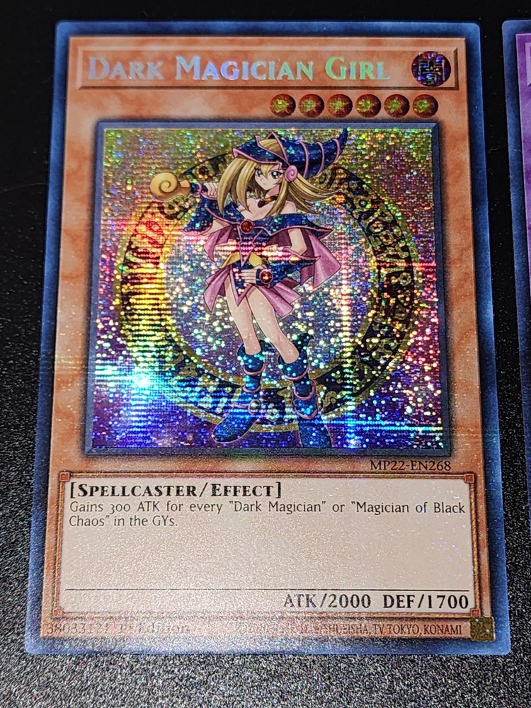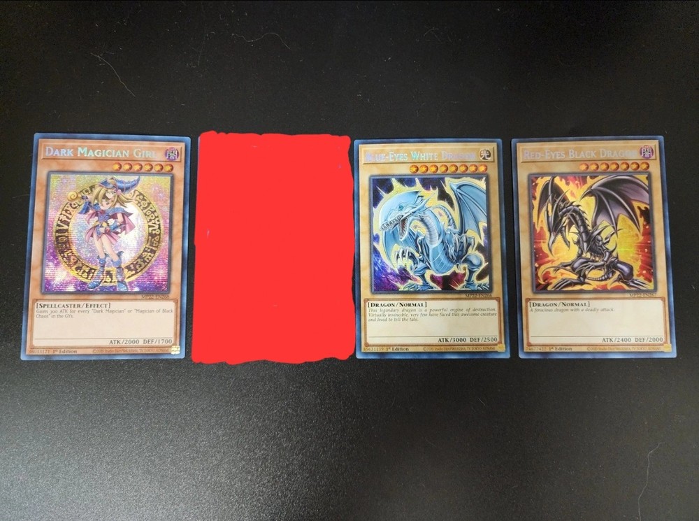 *Comes with 1x Dark Magician Girl & & 1x Blue Eyes White Dragon & 1x Red Eyes Black Dragon from the MP22 tin set! Collect the 3 most desirable Prismatic Secret Rare cards in the set without the hassle! The product is a complete set of Yu-Gi-Oh! cards from the Yugi series, featuring cards with red and blue attributes such as Blue Eyes and Red Eyes Dragon. The set includes cards from the Yu-Gi-Oh! Trading Card Game manufactured by Konami, with a prismatic secret rare rarity and a holo finish. The cards are in near mint or better condition, making them highly collectible for fans of the game. This set contains 1st edition cards of popular characters such as Yami Yugi, Seto Kaiba, and Joey Wheeler, making it a valuable addition to any Yu-Gi-Oh! card collection.