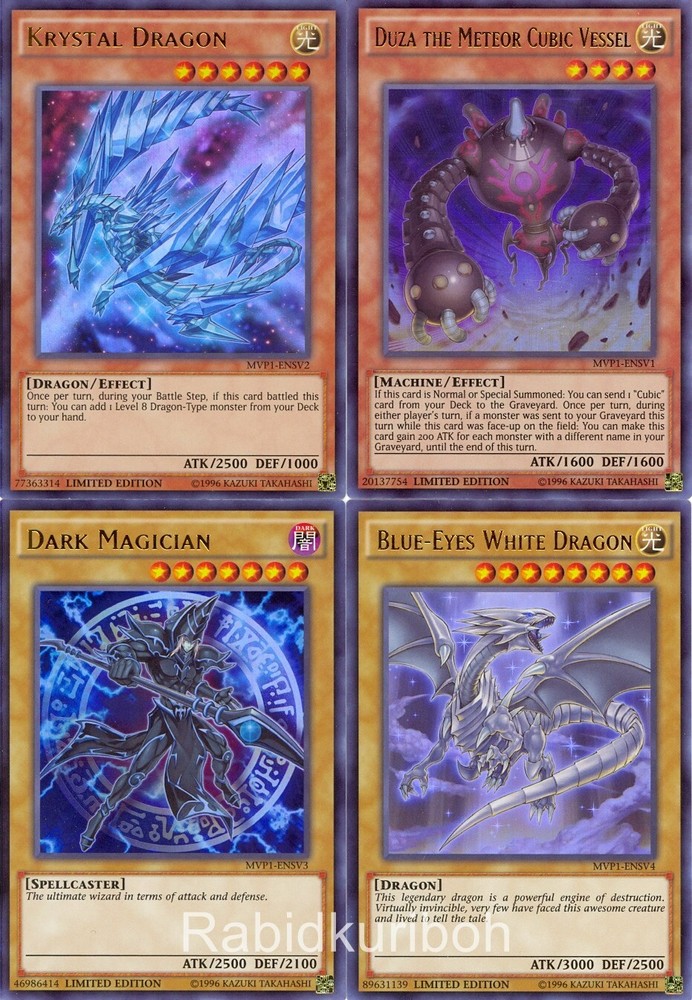 Selling what's listed below. Cards are in near mint or better condition unless specified below. The card(s) edition (1st, unlimited, limited) may be different from what is pictured. If this is important to you, please message me before buying so I can verify. Duza the Meteor Cubic Vessel - MVP1-ENSV1 - Ultra Rare Krystal Dragon - MVP1-ENSV2 - Ultra Rare Blue-Eyes White Dragon - MVP1-ENSV4 - Ultra Rare Dark Magician - MVP1-ENSV3 - Ultra Rare Shipping is by USPS. Cards are shipped safely in a top loader.