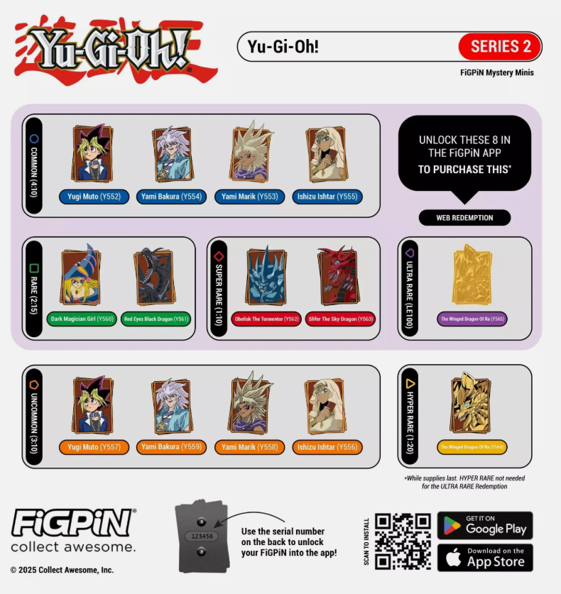 This listing is for the 1 pin pictured. This is a brand new, locked (Code has NOT been redeemed in the app) official Konami/Yu-Gi-Oh! FigPin mini. This comes from the Yugioh Mystery Series 2 FigPin Minis boxes. This pin is the "Rare" rarity. The pull rates are shown in the 2nd photo of this listing.