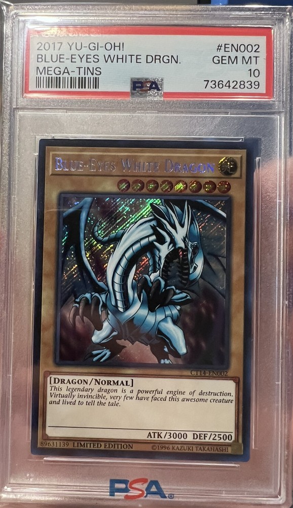 Yugioh PSA 10 GEM MINT Blue-Eyes White Dragon CT14-EN002 Secret Rare Promo Will come in a PSA Sleeve and bubble mailer to make sure it does not get damaged in shipping. Please message me if you have any questions Thanks! ~Shoutai
