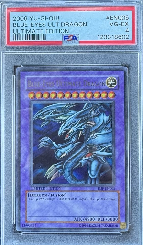 The product is a Yu-Gi-Oh! Blue-Eyes Ultimate Dragon card from the Ultimate Edition set, graded as a PSA 10 GEM MT. This rare card features the Blue attribute, foil finish, and is limited edition, making it a highly sought after collectible for Yu-Gi-Oh! TCG enthusiasts. Manufactured by Konami in 2006, this English language card is a valuable addition to any Yu-Gi-Oh! card collection, especially for fans of the Ultimate Edition set.