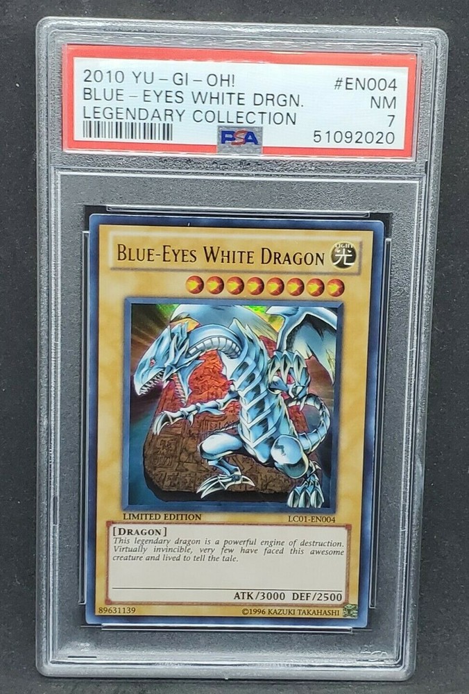 You are bidding on a Yugioh PSA 7 NM Blue-Eyes White Dragon 1st Edition Ultra Rare Card# LC01-EN004 from YuGiOh Legendary Collection 1 !!! This card has been graded as NM - a 7 - by PSA!!! An incredible addition to any collection! Do note that multiple PSA 7 graded copies of this card are available; the specific PSA Certification Number you get may vary slightly from the one in the photo. We are a US Seller! Shipping on all items is FREE inside the United States. For international orders we use eBay's Global Shipping Program. All shipping charges, taxes, fees, etc. for international orders are calculated and collected by eBay at checkout.! All cards will be shipped in sleeves, Top Loaders (or similar), and a padded envelope or appropriately sized padded box for safe arrival. In this case, the PSA-cased card will be in a graded card sleeve as well. For orders over $250, please be advised that signature confirmation is required. Please allow 2-3 business days handling time. Make sure to check out our other listings for all of your favorite Trading Card Games! Thanks for shopping at Yeti Gaming!