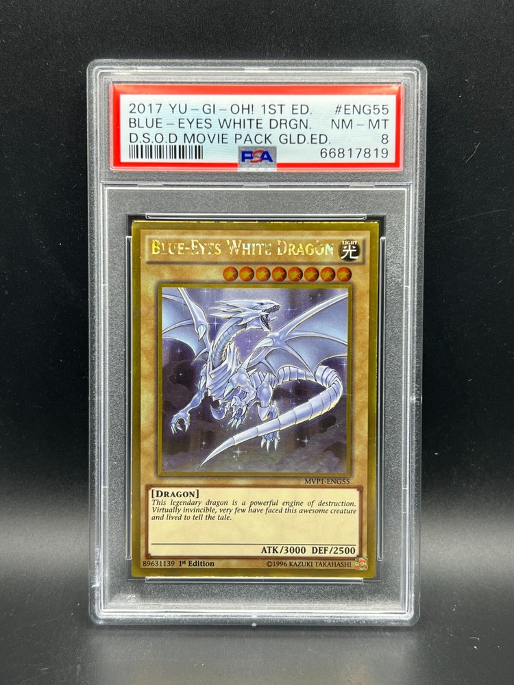 You are bidding on a Yugioh PSA 8 NM-MT Blue-Eyes White Dragon MVP1-ENG55 Gold Rare 1st Edition from the Darkside of Dimensions Movie Pack Gold Edition!! This card has been graded as NM-MT - a 8 - by PSA!!! An excellent addition to any collection! Shipping is FREE on this item in the United States! All PSA cards will be shipped in a padded envelope or appropriately sized padded box, with a graded card sleeve surrounding the PSA Case. For orders over $250, please be advised that signature confirmation is required. For any questions regarding shipping or otherwise, please contact us prior to purchase. Please allow 2-3 business days handling time. Make sure to check out our other listings for all of your favorite Trading Card Games! Thanks for shopping at Yeti Gaming!