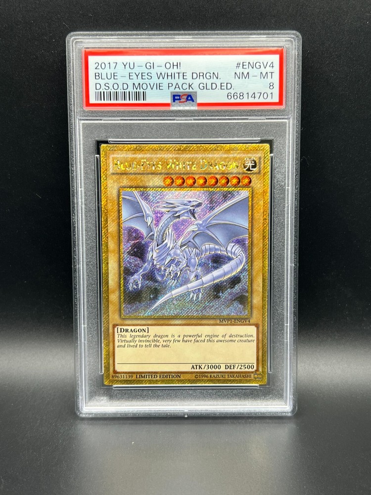 You are bidding on a Yugioh PSA 8 NM-MT Blue-Eyes White Dragon MVP1-ENGV4 Gold Secret Rare Limited Edition from the Dark Side of Dimensions Movie Pack!! This card has been graded as NM-MT - an 8 - by PSA!! Shipping is FREE on this item in the United States! All PSA cards will be shipped in a padded envelope or appropriately sized padded box, with a graded card sleeve surrounding the PSA Case. For orders over $250, please be advised that signature confirmation is required. For any questions regarding shipping or otherwise, please contact us prior to purchase. Please allow 2-3 business days handling time. Make sure to check out our other listings for all of your favorite Trading Card Games! Thanks for shopping at Yeti Gaming!