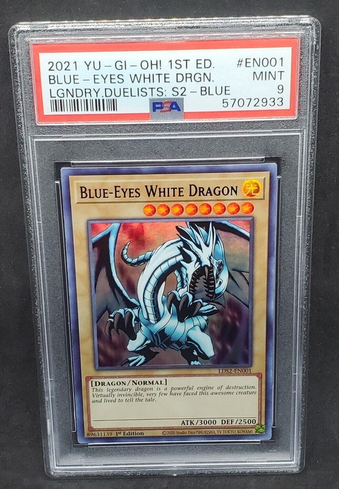 You are bidding on a Yugioh PSA 9 MINT Blue-Eyes White Dragon (Blue) 1st Edition Ultra Rare Card# LDS2-EN001 !!! This card has been graded as MINT - a 9 - by PSA!!! An excellent addition to any collection! Do note that multiple PSA 9 graded copies of this card are available; the specific PSA Certification Number you get may vary slightly from the one in the photo. Shipping is FREE on this item in the United States! All PSA cards will be shipped in a padded envelope or appropriately sized padded box, with a graded card sleeve surrounding the PSA Case. For orders over $250, please be advised that signature confirmation is required. For any questions regarding shipping or otherwise, please contact us prior to purchase. Please allow 2-3 business days handling time. Make sure to check out our other listings for all of your favorite Trading Card Games! Thanks for shopping at Yeti Gaming!