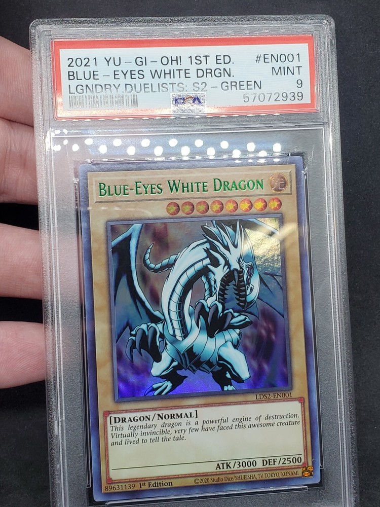 You are bidding on a Yugioh PSA 9 MINT Blue-Eyes White Dragon (Green) 1st Edition Ultra Rare Card# LDS2-EN001 !!! This card has been graded as MINT - a 9 - by PSA!!! An excellent addition to any collection! Do note that multiple PSA 9 graded copies of this card are available; the specific PSA Certification Number you get may vary slightly from the one in the photo. Shipping is FREE on this item in the United States! All PSA cards will be shipped in a padded envelope or appropriately sized padded box, with a graded card sleeve surrounding the PSA Case. For orders over $250, please be advised that signature confirmation is required. For any questions regarding shipping or otherwise, please contact us prior to purchase. Please allow 2-3 business days handling time. Make sure to check out our other listings for all of your favorite Trading Card Games! Thanks for shopping at Yeti Gaming!