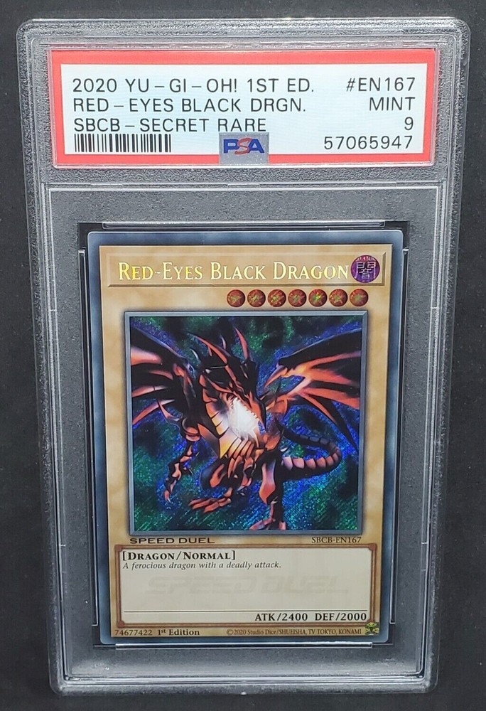 You are bidding on a Yugioh PSA 9 MINT Red-Eyes Black Dragon 1st Edition Secret Rare Card# SBCB-EN107 !!! This card has been graded as MINT - a 9 - by PSA!!! An incredible addition to any collection! Do note that multiple PSA 9 graded copies of this card are available; the specific PSA Certification Number you get may vary slightly from the one in the photo. Shipping is FREE on this item in the United States! All PSA cards will be shipped in a padded envelope or appropriately sized padded box, with a graded card sleeve surrounding the PSA Case. For orders over $250, please be advised that signature confirmation is required. For any questions regarding shipping or otherwise, please contact us prior to purchase. Please allow 2-3 business days handling time. Make sure to check out our other listings for all of your favorite Trading Card Games! Thanks for shopping at Yeti Gaming!