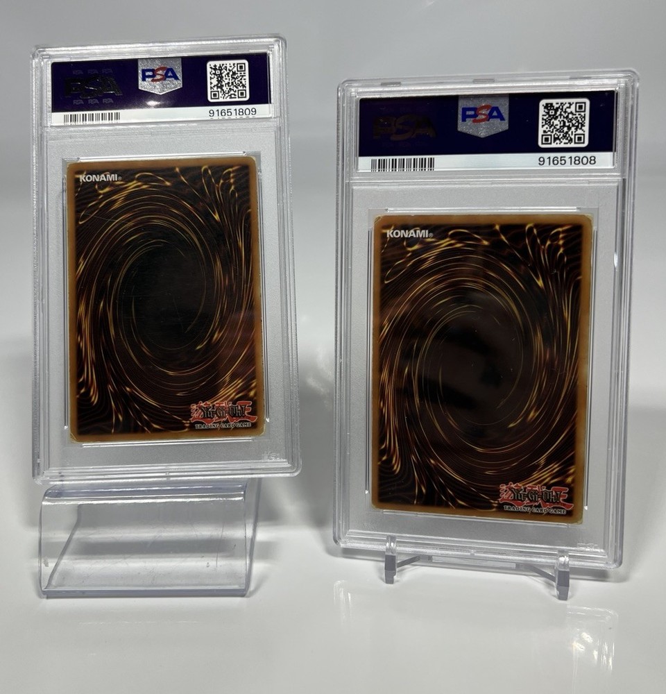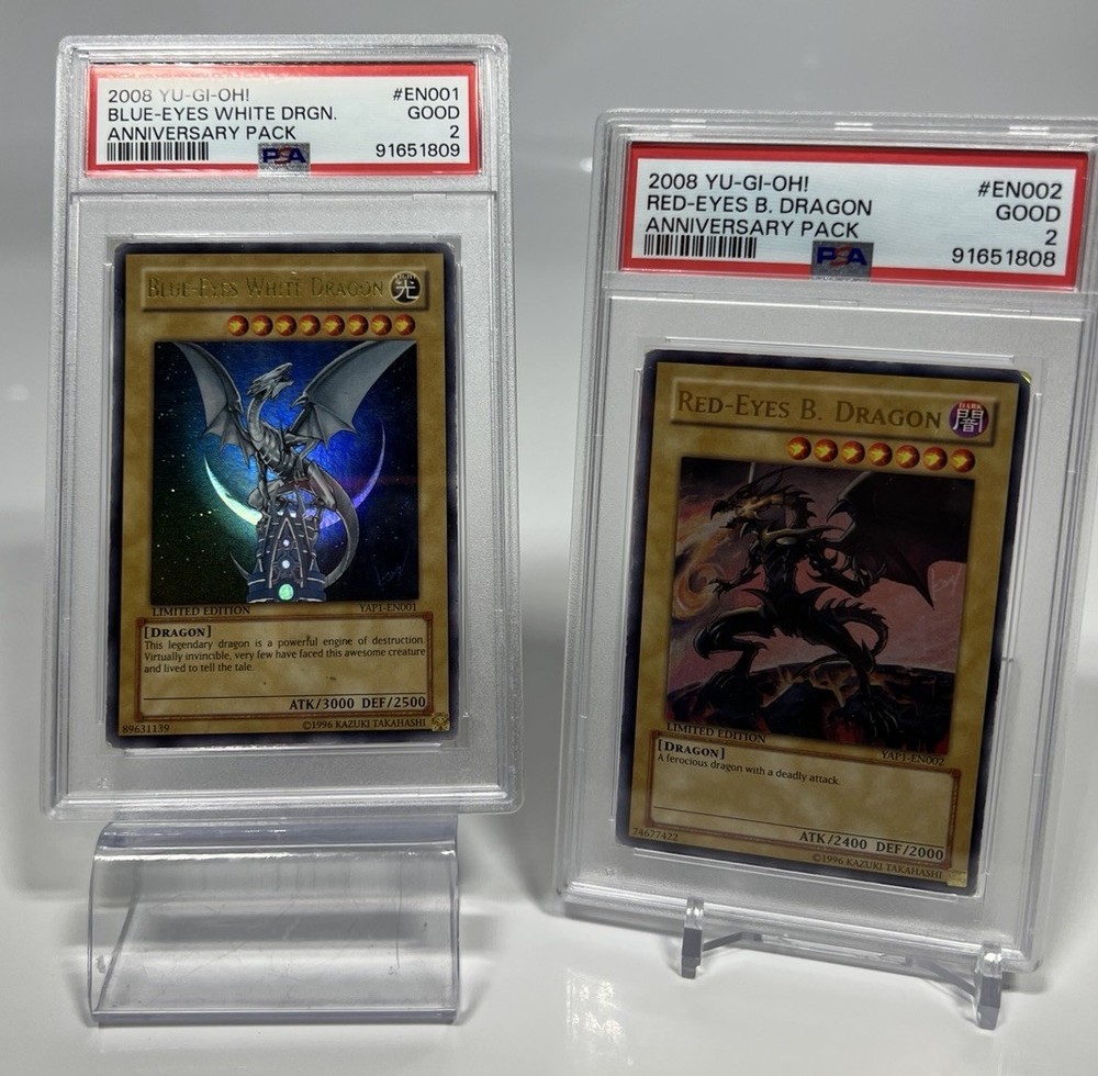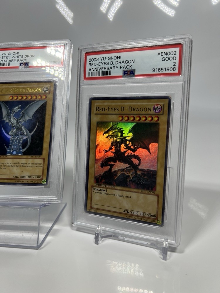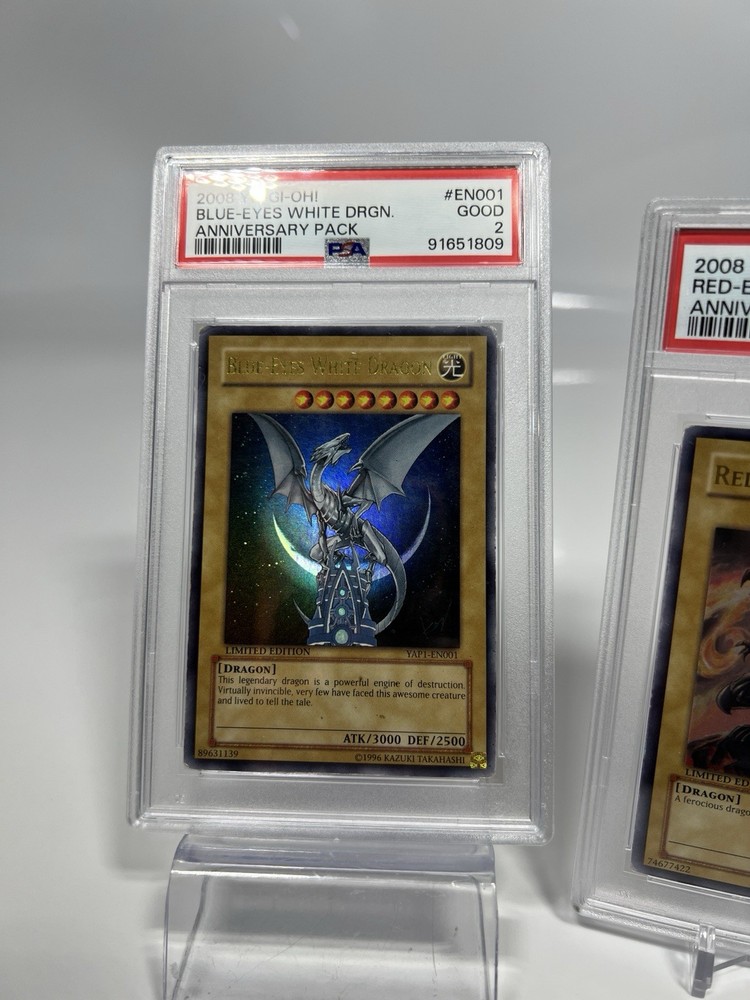 Lot of two PSA Graded cards, both PSA 2 The product is a lot of Yu-Gi-Oh cards, specifically the Blue-Eyes White Dragon (YAP1-EN001) and Red-Eyes Black Dragon (EN002). These cards are highly sought after by collectors and players alike for their rarity and powerful abilities. The cards are graded by PSA, ensuring their authenticity and quality. This lot would be a valuable addition to any Yu-Gi-Oh card collection.
