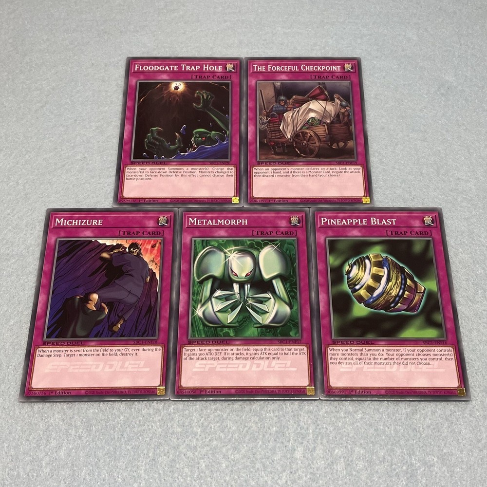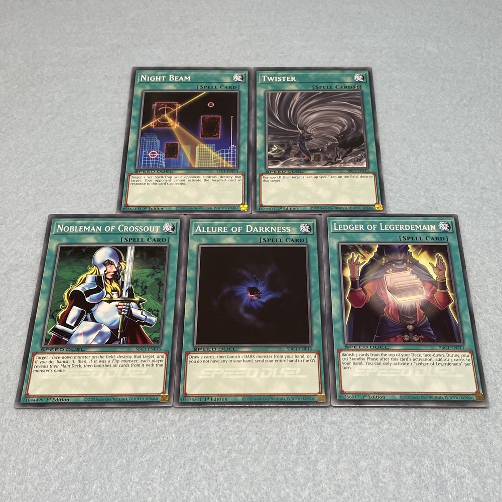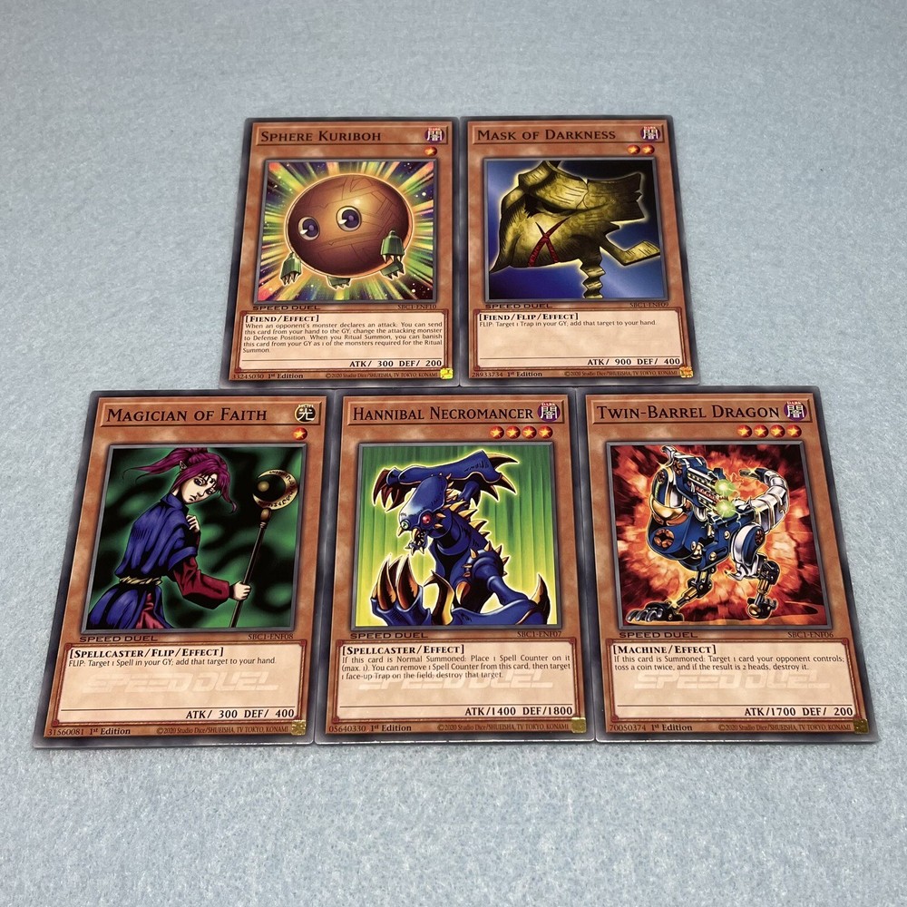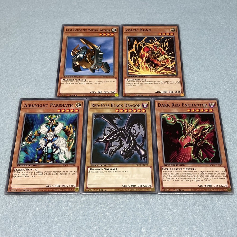You will receive all of the cards listed. All cards are in near-mint condition 1 Red-Eyes Black Dragon 1 Gear Golem the Moving Fortress 1 Voltic Kong 1 Airknight Parshath 1 Dark Red Enchanter 1 Twin-Barrel Dragon 1 Hannibal Necromancer 1 Magician of Faith 1 Mask of Darkness 1 Sphere Kuriboh 1 Ledger of Legerdemain 1 Allure of Darkness 1 Twister 1 Night Beam 1 Nobleman of Crossout 1 Pineapple Blast 1 Metalmorph 1 Michizure 1 The Forceful Checkpoint 1 Floodgate Trap Hole All cards are Speed Duel edition, and can be used in any Yu-Gi-Oh play format (including non-Speed Duel formats).