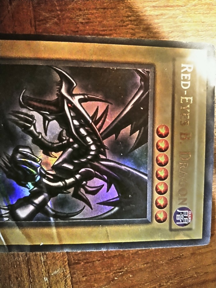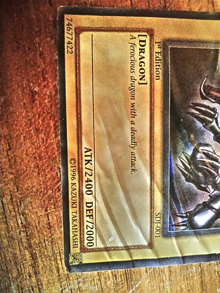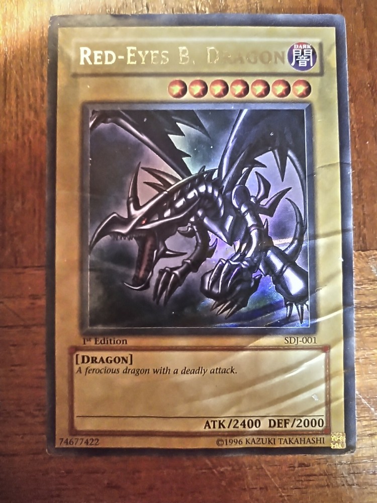 Yugioh Red Eyes B. Dragon LOB A070 1st Edition Ultra Rare English MP. Card was water damaged, rear of card has parts of the surface rubbed off, front of card has wrinkles but is legible and playable.