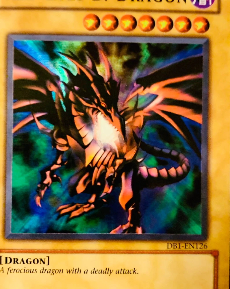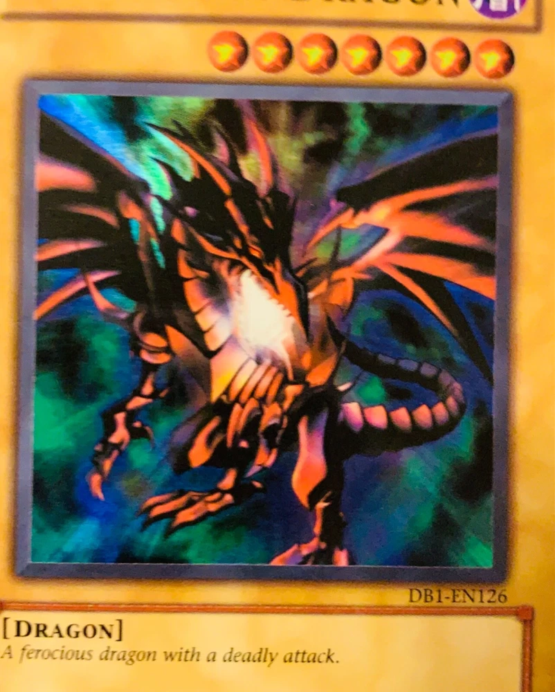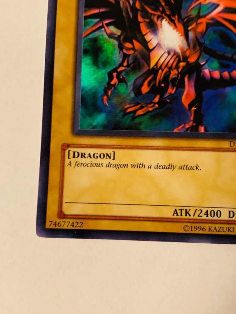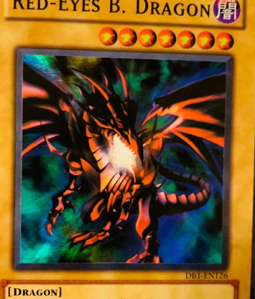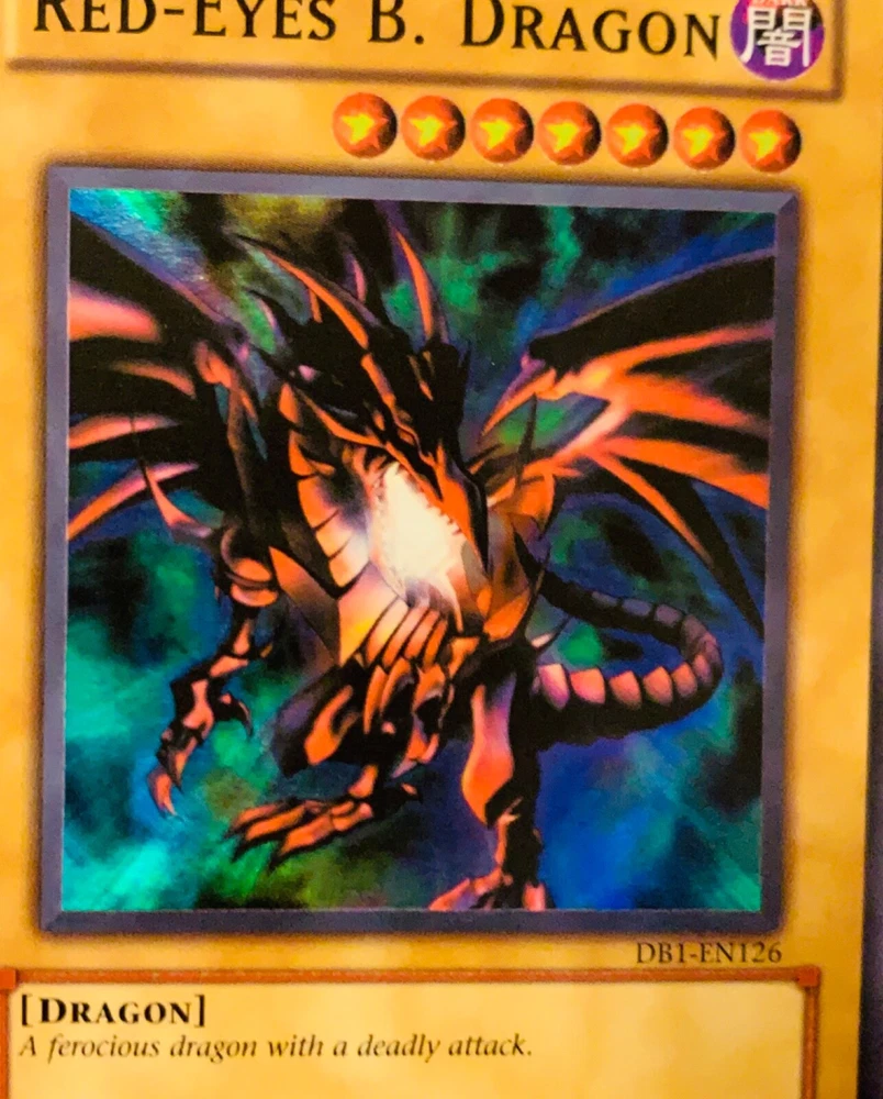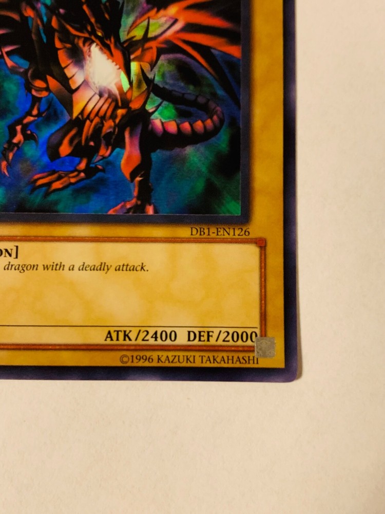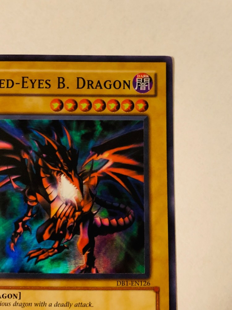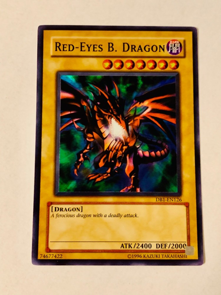 This is a Japanese Red Eyes B. Dragon card from the Dark Beginning 1 set, manufactured by Konami in 1996. It is a vintage card made of card stock with a holo finish, and is classified as a Yu-Gi-Oh! TCG Super Rare Monster card with card number DBI-EN126. It has an attack power of 2400 and a defense/toughness of 2000, making it a valuable addition to any collection. The card is in excellent condition and has features like unlimited printing, making it a great buy for any collector or player.