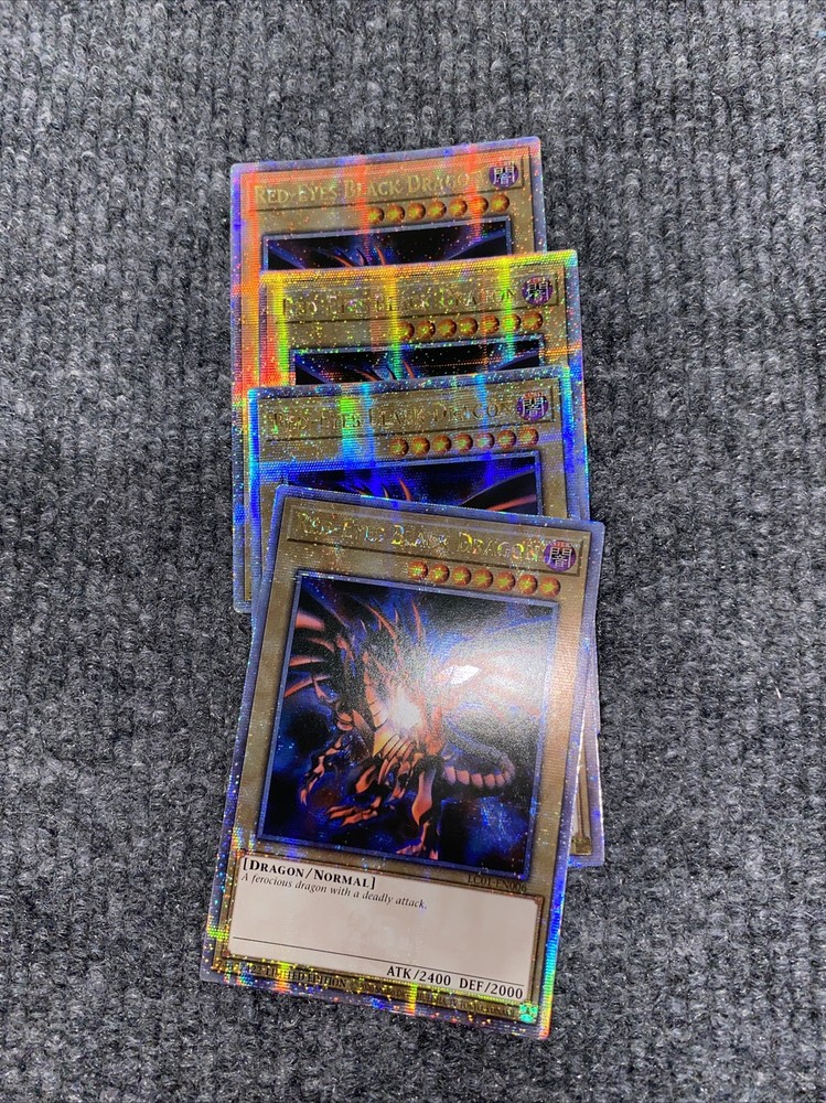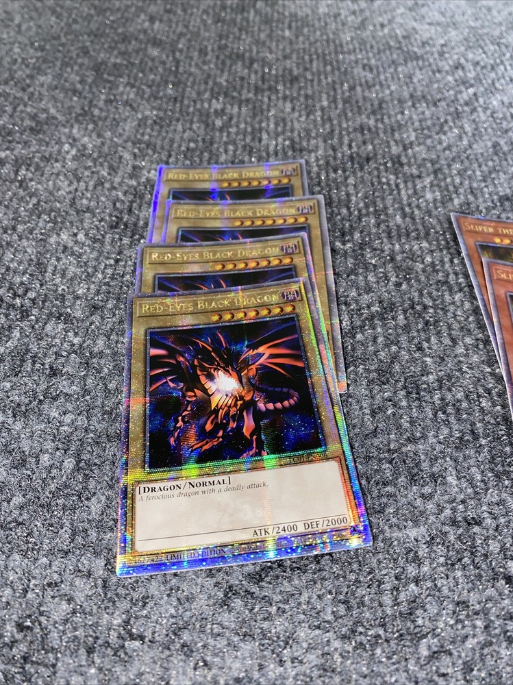This Red-Eyes Black Dragon Quarter Century Rare is absolutely stunning! The holographic foil makes it pop, and the condition is flawless. A must-have for collectors and duelists alike. Getting a set of four is an amazing deal—perfect for deck-building or displaying. The 25th-anniversary rarity adds serious value. Highly recommend!