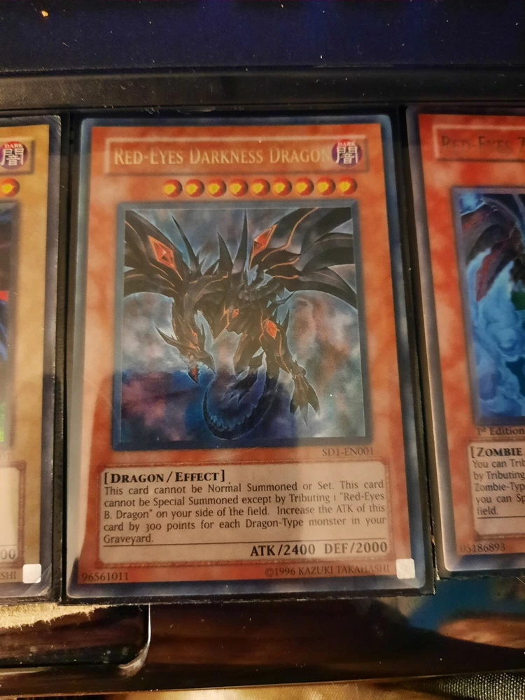 Yugioh Red Eyes Black Dragon Lot. Cards are used. RED EYES B CHICK SOD-EN017 RED EYES B DRAGON PCJ-EN001 RED EYES DARKNESS DRAGON SD1-EN001 RED EYES ZOMBIE DRAGON SDZW-EN001...
