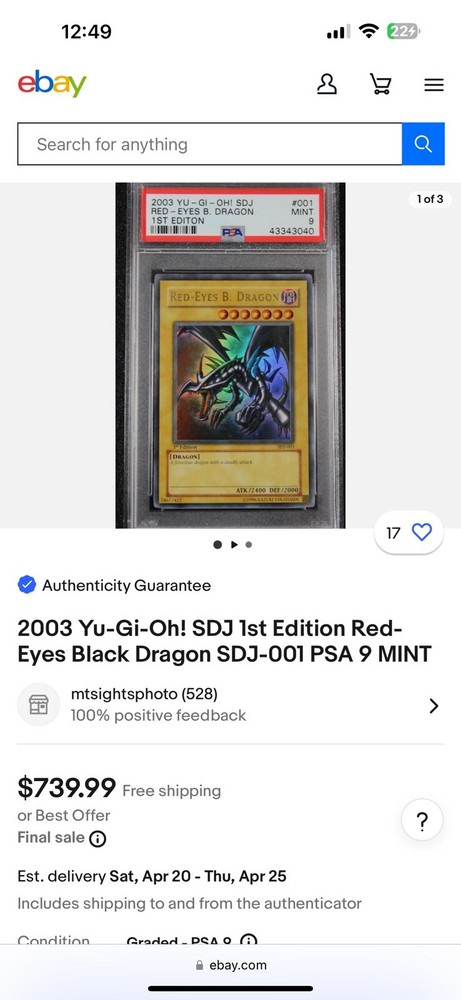 Yugioh Red Eyes Black Dragon SDJ-001 1st Edition PSA 9. Condition is Graded. Shipped with USPS Ground Advantage....