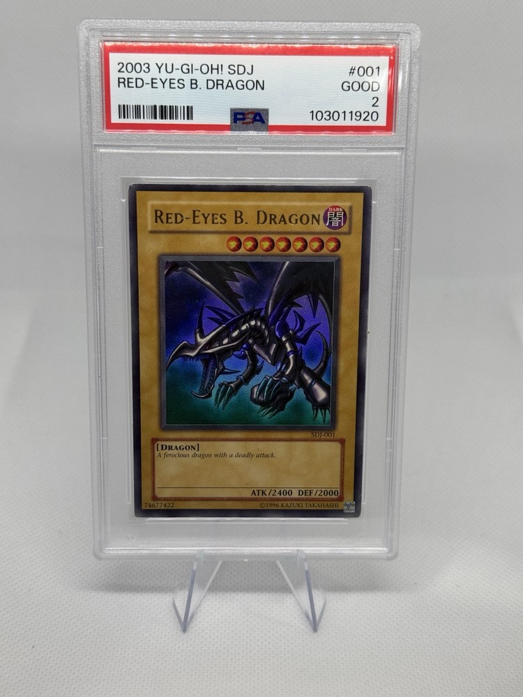 The Yugioh Red Eyes Black Dragon Unlimited SDJ-001 has been professionally graded by Professional Sports Authenticator (PSA) and received a grade of 2. This collectible card game individual card is highly sought after by Yugioh enthusiasts and collectors. The PSA grading provides authentication and a standardized evaluation of the card's condition, making it a valuable addition to any Yugioh card collection.