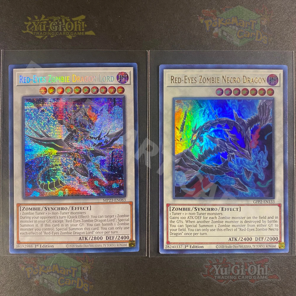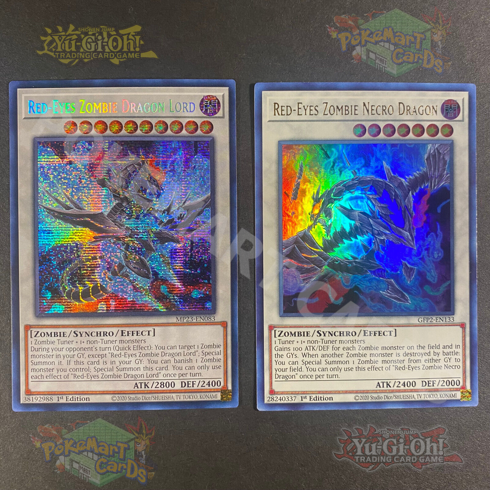 Yugioh Red Eyes Zombie Dragon Lord Prismatic Secret Rare MP23-EN083 1st Edition NM Yugioh Red Eyes Necro Dragon Ultra Rare GFP2-EN133 1st Edition NM Play set available! Volume discount available! Condition is Near Mint. FREE SHIPPING! Combined orders over $30 are upgraded to USPS Ground Advantage for free! Thank you for shopping at Pokemart Cards! Check out more cards HERE!