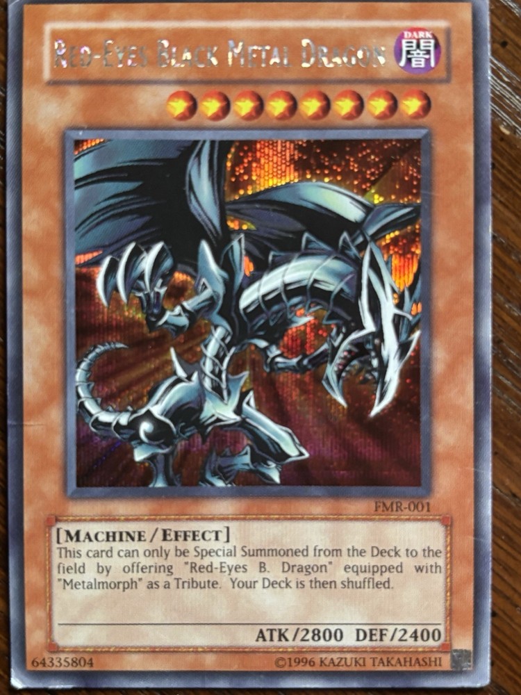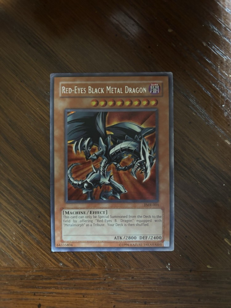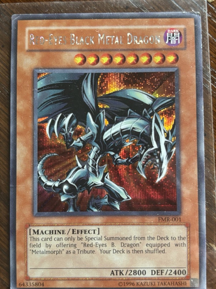 The Yu-Gi-Oh! Red-Eyes Black Metal Dragon card, from the Yugi set, is a highly sought-after collectible in the world of collectible card games. With its powerful abilities and striking design, this FMR-001 card is a valuable addition to any Yu-Gi-Oh! TCG collection. Whether you're a seasoned player or a dedicated collector, this iconic card is sure to make a fierce impact in your game or display cabinet. Crease on left side as well as some damage on corners, mildly used card.