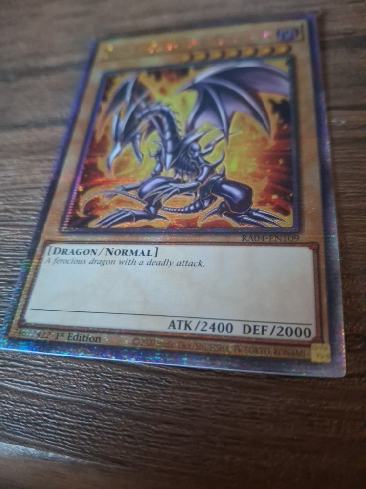 The product is a Yugioh Red-Eyes Black Dragon card from the Quarter Century Stampede set. This card is a Dark type Dragon with 2000 Defense and 2400 Attack power. It is a Quarter Century Secret Rare 1st Edition manufactured by Konami for the Yu-Gi-Oh! TCG. The card is in English and belongs to the Normal card type with the card number RA04-EN109. This highly sought-after collectible is a must-have for any Yu-Gi-Oh! card collector.