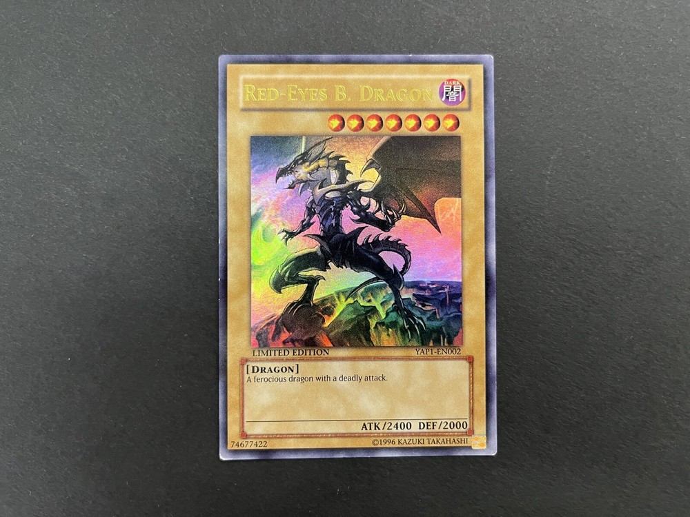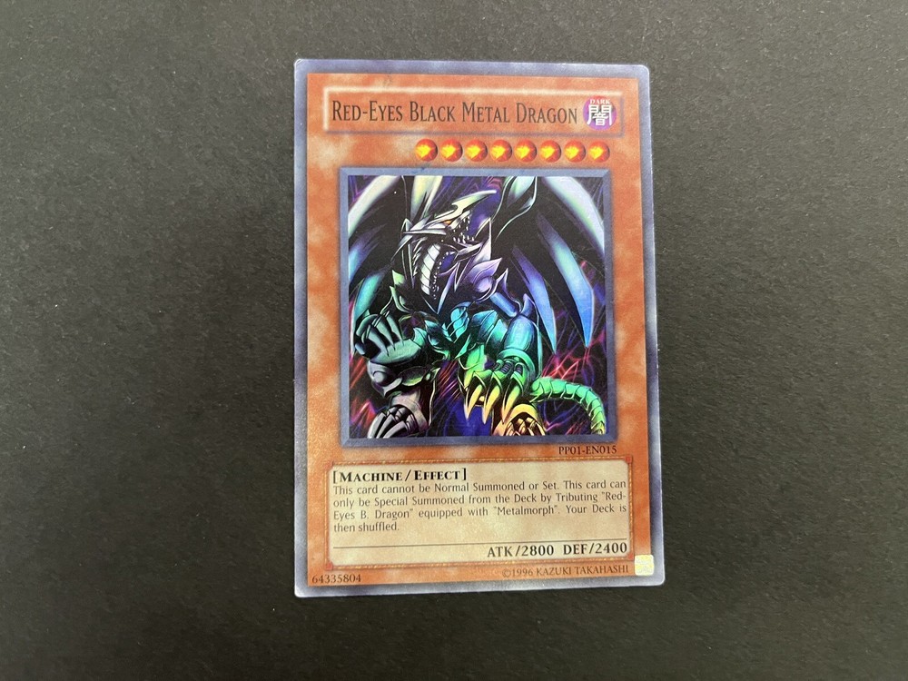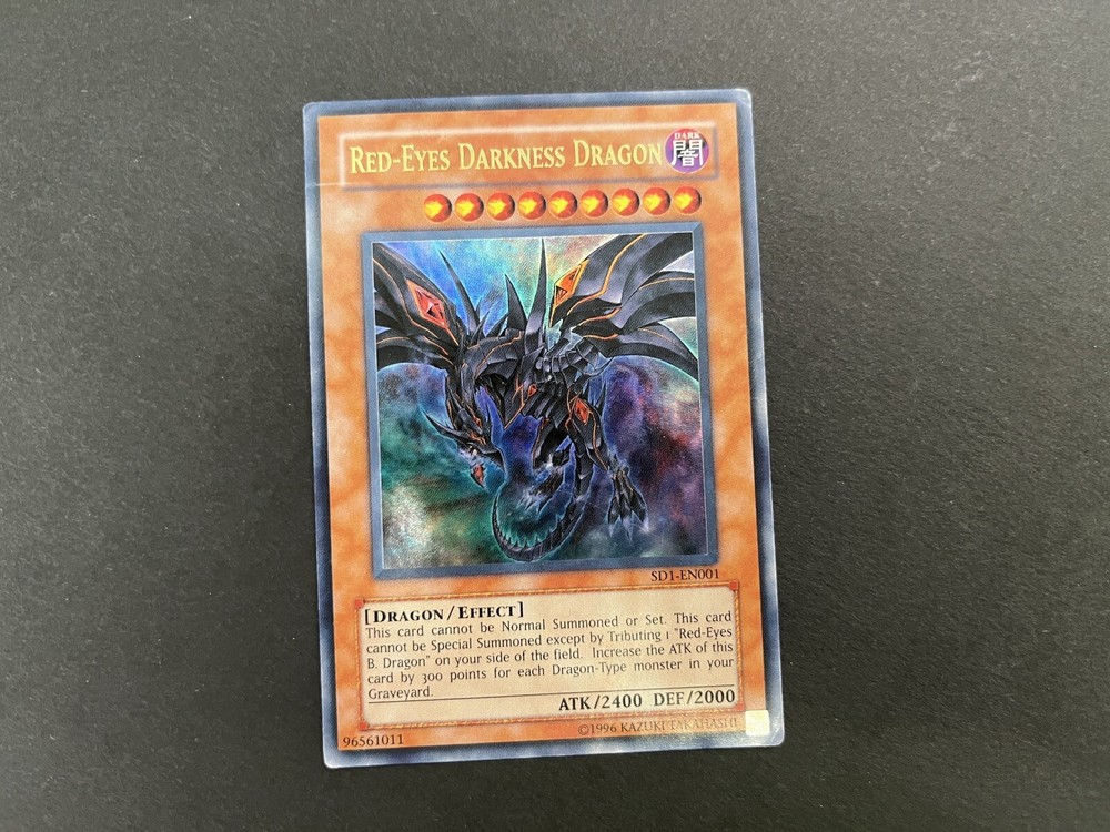 Yu-Gi-Oh Red-Eyes Set YAP1-EN002 - Red-Eyes Black Dragon - Ultra Rare, Limited Edition PP01-EN015 - Red-Eyes Black Metal Dragon - Super Rare SD1-EN001 - Red-Eyes Darkness Dragon - Ultra Rare SDMM-EN033 - Metalmorph - Common Cards are used, but in excellent condition. See pictures for details.