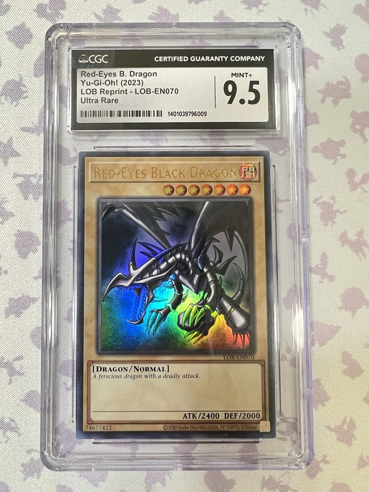 This Yugioh card features the iconic Red-Eyes Black Dragon, with a foil finish and a card size of standard. It is part of the Legend of Blue Eyes White Dragon set and has been manufactured in 2023 by Konami. The card is a reprint and has been graded 9.5 by Certified Guaranty Company (CGC), ensuring its quality. The card is made of card stock material and has a defense/toughness of 2000, with an attack/power of 2400. It belongs to the Dragon creature/monster type and has a card number of 2023. The card is in English language and is suitable for collectors aged 6+. It is a great addition to any collection and perfect for fans of the Yu-Gi-Oh! TCG game.