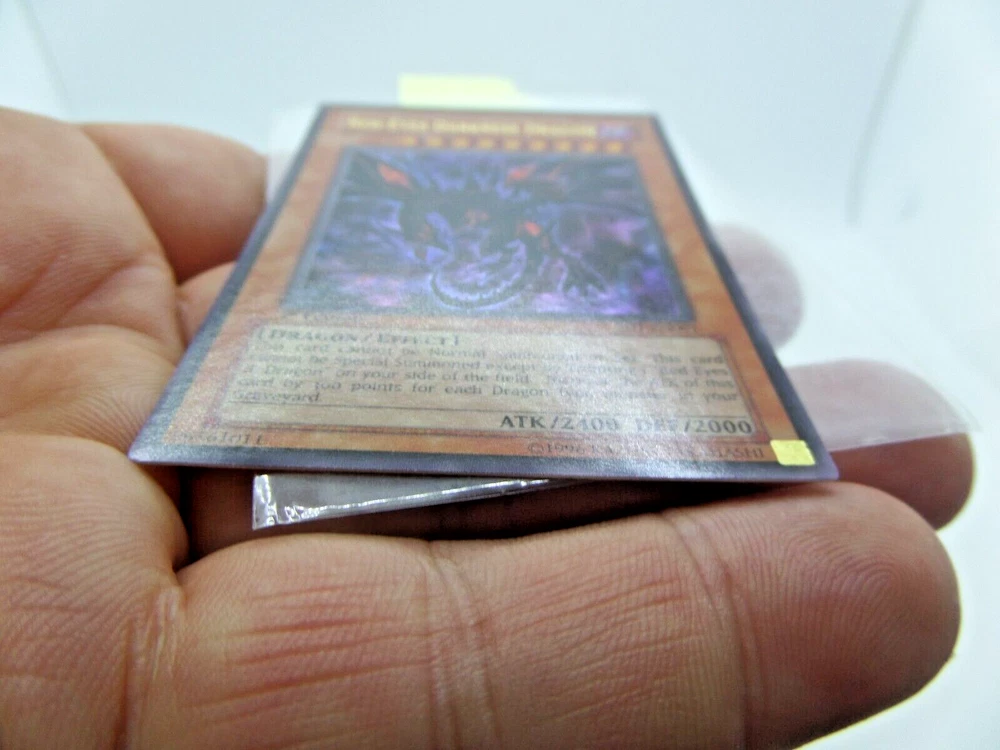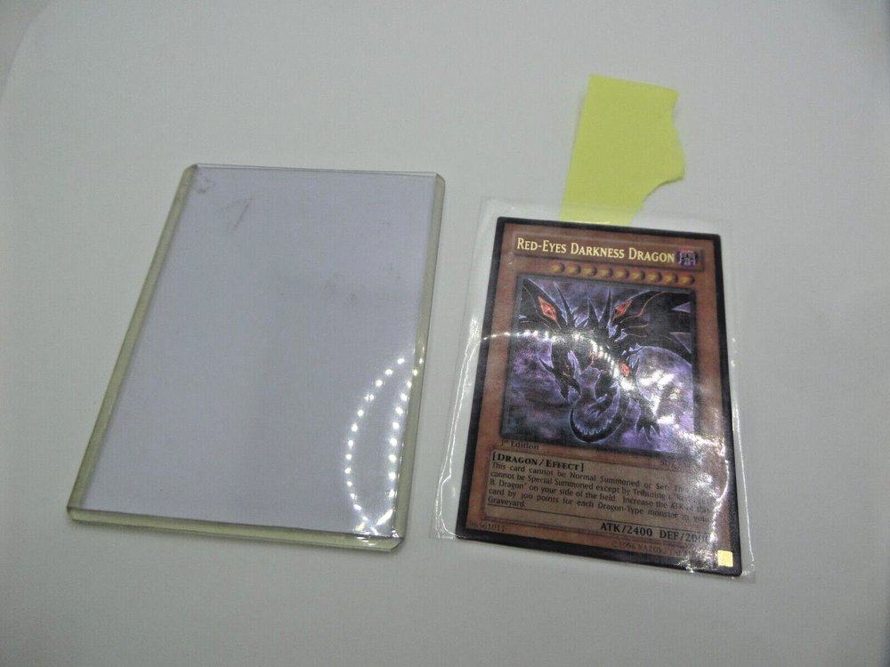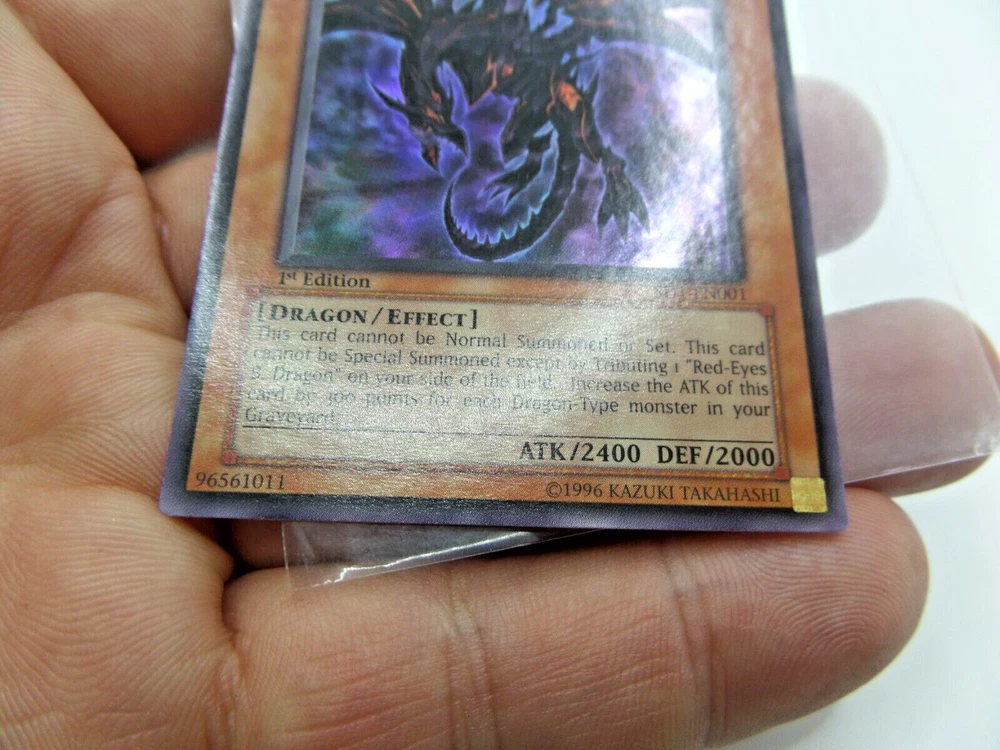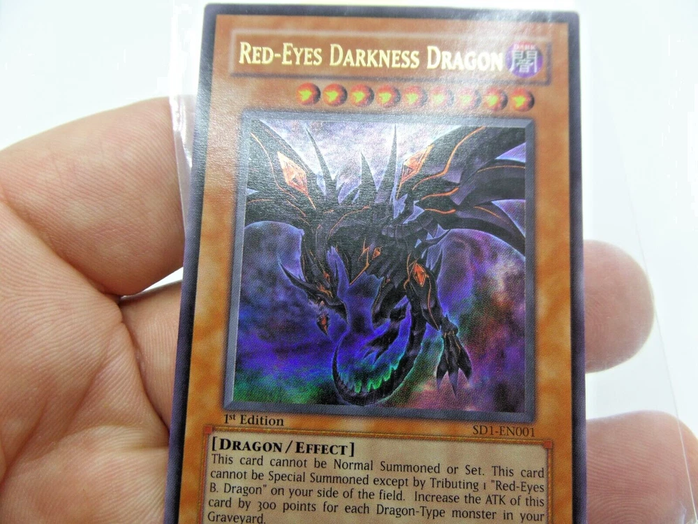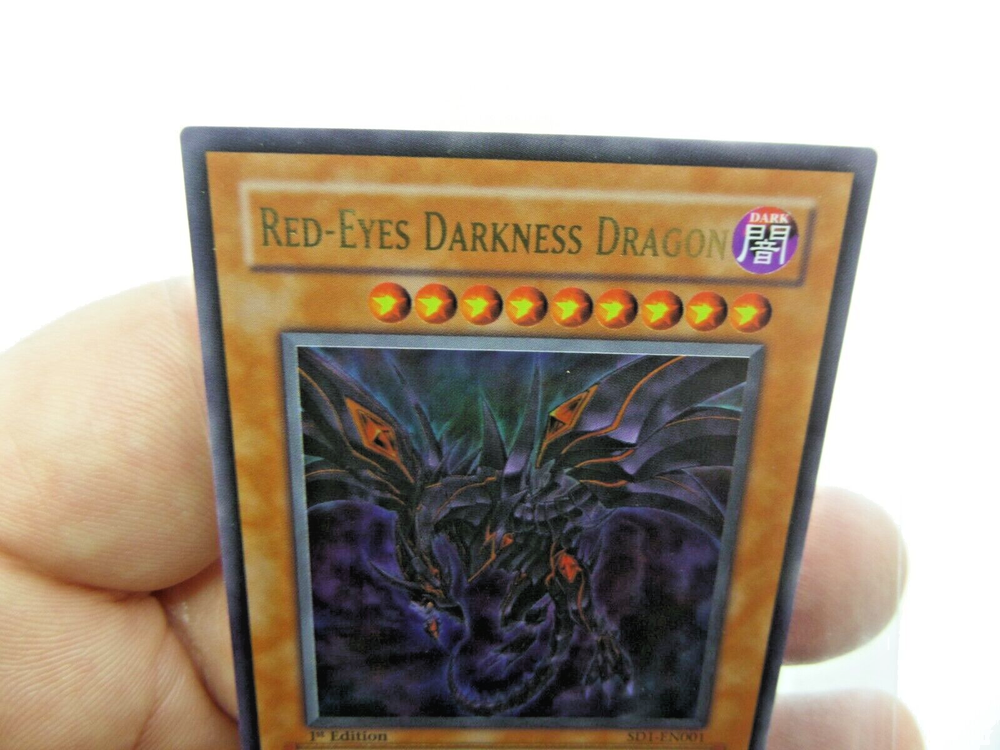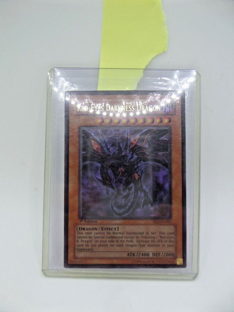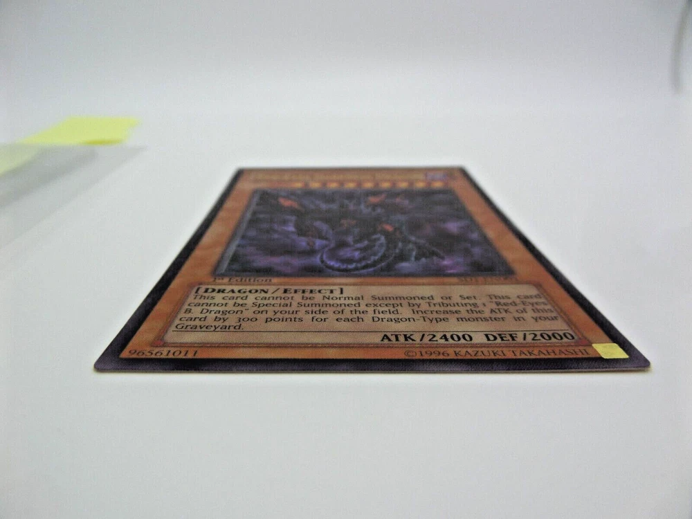 1 = Yugioh Red-Eyes Darkness Dragon 1st Edition SD1-EN001 Structure Deck Card. **SMALL CREASE ON TOP - SEE PIC.** **CARDS ARE NOT GRADED or THOROUGHLY CHECKED FOR SCRATCHES, SCUFFS, BENT ENDS, ETC - PLEASE SEE PICTURES** (We can take 1-5 pictures for you if needed, please just ask us through eBay messenger) Card looks like its in fairly good shape, but we are NOT card experts, So please check out the pictures on this card Yourself. 1st edition, 1996 Kazuki Takahashi/ Konami Trading Card Game. Card is in two sleeves. Came out of an Estate Sale from a collector - we will be posting more cards up as fast as we can. This card has scuffs, scratches, bent ends, other damage, etc. ***ALL CARDS ARE SOLD AS-IS WHERE IS, NO REFUNDS, NO RETURNS, NOT GRADED, COULD HAVE DAMAGE, YOU'RE TAKING FULL RISK.*** FREE USPS SHIPPING TO LOWER 48 STATES ONLY. Product Details This card cannot be Normal Summoned or Set. This card cannot be Special Summoned except by Tributing 1 "Red-Eyes B. Dragon" on your side of the field. Increase the ATK of this card by 300 points for each Dragon-Type monster in your Graveyard. Number: SD1-EN001 Rarity: Ultra Rare Attribute Monster Type/Card Type: DARK Dragon/Effect Monster Level: 9 A / D: 2400 / 2000