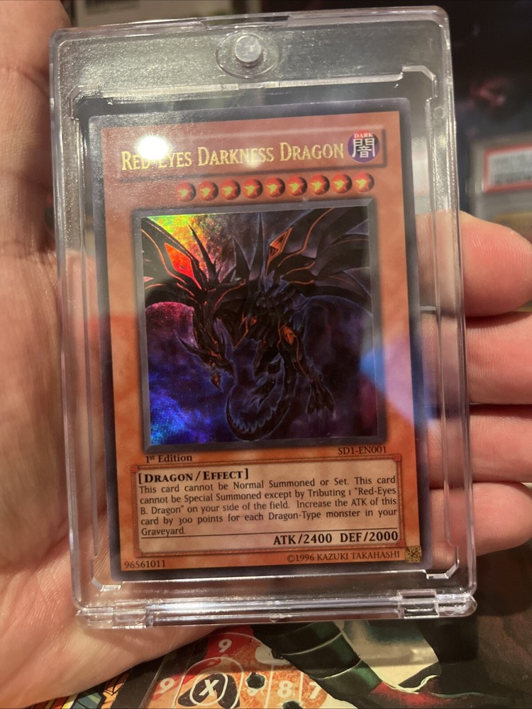 This 1st edition Red-Eyes Darkness Dragon card from the Yu-Gi-Oh! TCG is a highly sought-after ultra rare card that will make a great addition to any collection. The card features a dark dragon creature type and has been kept in near mint or better condition, making it a valuable vintage item. The card is from the Dragon's Roar set and has a card number of SD1-EN001. It is an effect card with the unique features of being a 1st edition and holo card. This card was manufactured in the United States in 1996, and is a must-have for any serious collector.