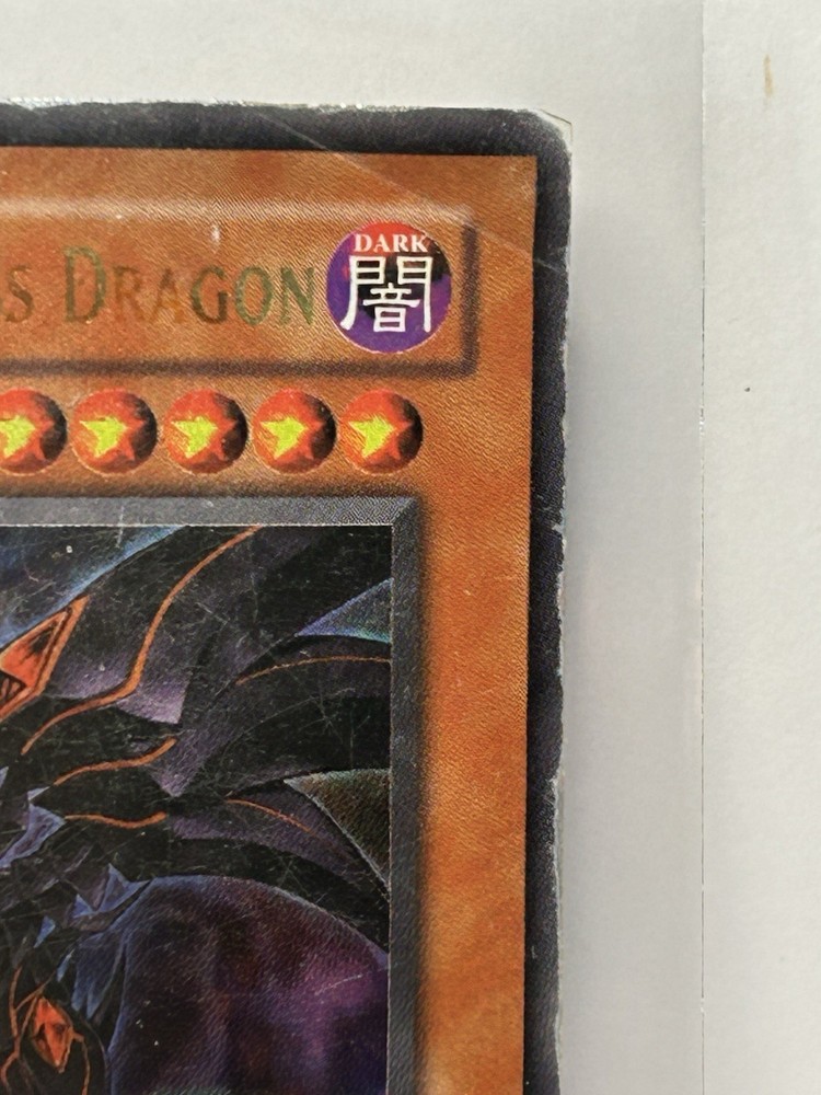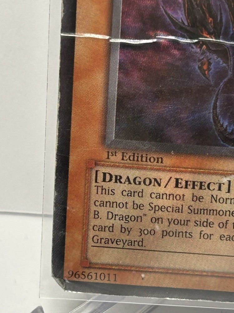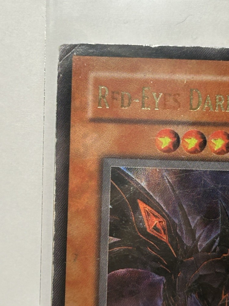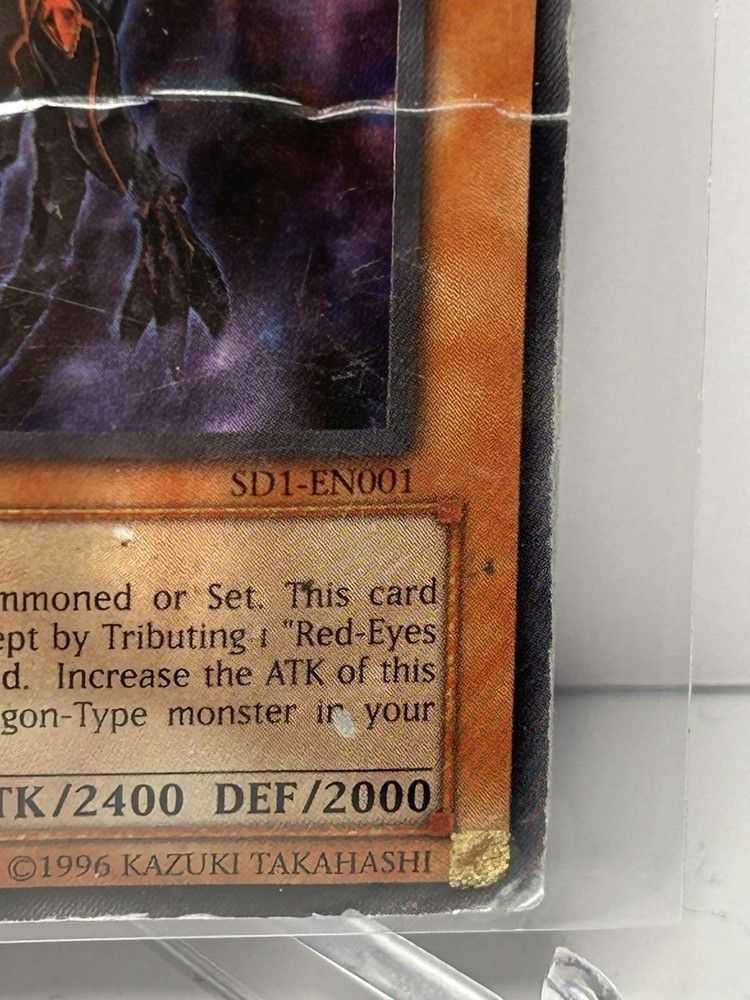 The Yugioh Red-Eyes Darkness Dragon SD1-EN001 1st Edition Ultra Rare card features a Dark Dragon creature type with a holo finish. Manufactured by Konami, this English-language card is part of the Yu-Gi-Oh! TCG and is suitable for ages 6 and up. As an Ultra Rare card with the standard size and no autograph, it is a highly sought-after collectible for fans and players of the game looking to expand their decks with powerful monsters. Heavy damage all over See pics YG 14