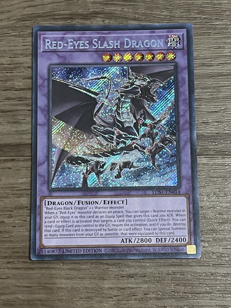 The Yugioh Red-Eyes Slash Dragon LDS1-EN014 Secret Rare Limited Edition card is a highly sought-after collectible for fans of the YUGIOH game. Released in 2020 as part of the Legendary Duelists: Season 1 set, this card features the iconic character Red-Eyes Slash Dragon. As a Secret Rare card, it is a valuable addition to any card collection and is sure to be a prized possession for any collector of CCG individual cards.