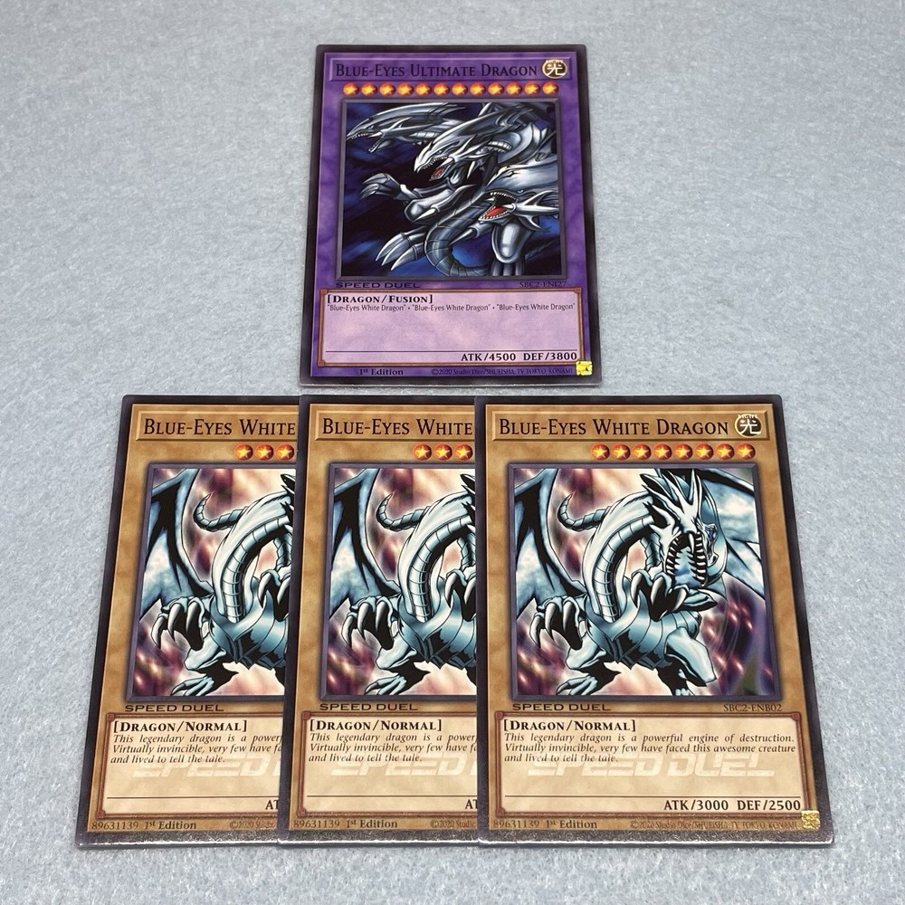 You will receive Seto Kaiba’s 64-card XYZ + Blue Eyes Ultimate Dragon Deck, which was used in the final stages of Battle City. You will receive the following cards: Monsters (24): 3x Blue-Eyes White Dragon 3x The King of D. 3x Des Feral Imp 3x Ancient Lamp 3x La Jinn the Mystical Genie of the Lamp 3x X-Head Cannon 3x Y-Dragon Head 3x Z-Metal Tank Spells (18): 3x Enemy Controller 3x Shrink 3x Union Hangar 3x The Flute of Summoning Dragon 3x Dragon Revival Rhapsody 3x Trade-In Traps (12): 3x Union Scramble 3x Shadow Spell 3x Loop of Destruction 3x Champion's Vigilance Extra Deck (10): 1x Blue-Eyes Ultimate Dragon 3x XYZ-Dragon Cannon 3x XY-Dragon Cannon 3x XZ-Tank Cannon Skill Cards (2): 1x Executive Privilege 1x Symbol of Pride All main deck cards are speed duel edition, and are permitted for use in ALL duel formats, including non speed duel formats. Skill cards are for speed duel format only.
