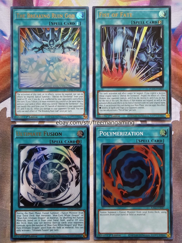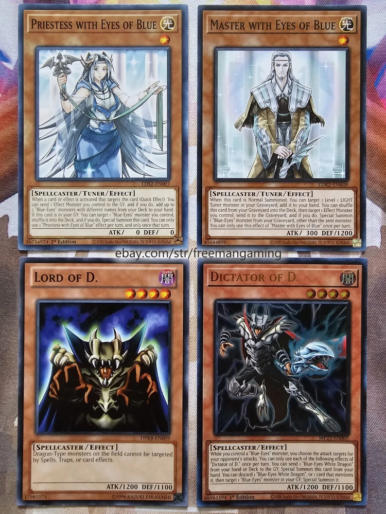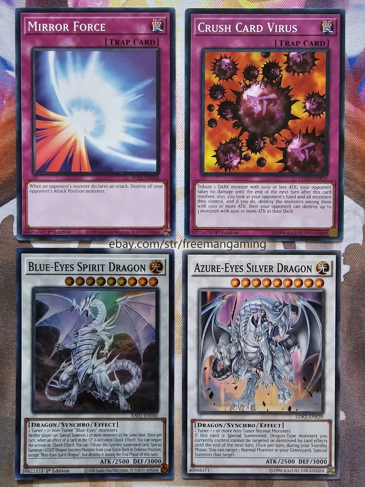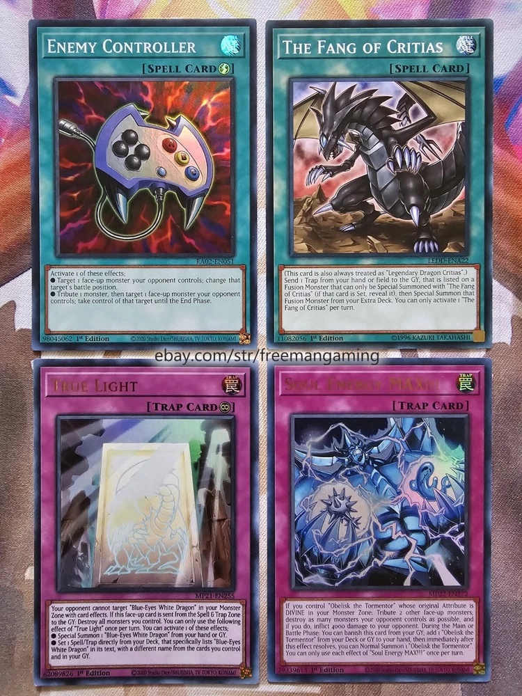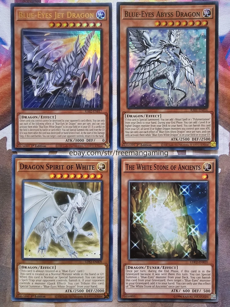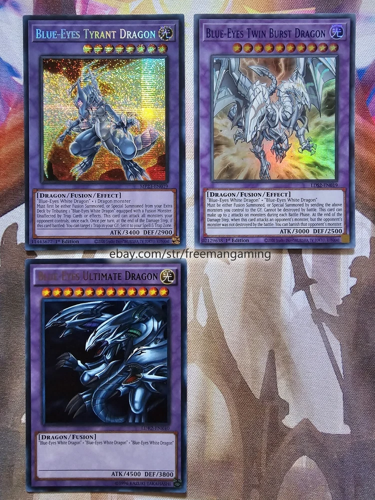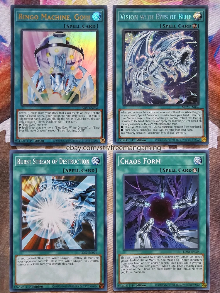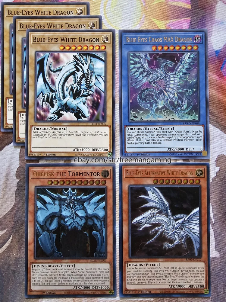 Item Description All cards are in NM Near Mint Condition. All cards included have been used by Seto Kaiba in the TV Show and official Konami Yugioh Video Games. Monsters - 19 3x Blue-Eyes White Dragon 1x Blue-Eyes Chaos MAX Dragon (ultra rare) 1x Obelisk the Tormentor (ultra rare) 1x Blue-Eyes Alternative Dragon (ultra rare) 1x Blue-Eyes Jet Dragon (ultra rare) 1x Blue-Eyes Abyss Dragon (super rare) 1x Dragon Spirit of White 1x The White Stone of Ancients 1x The White Stone of Legend 1x Sage with Eyes of Blue (secret rare) 1x Maiden with Eyes of Blue 1x Protector with Eyes of Blue 1x Priestess with Eyes of Blue 1x Master with Eyes of Blue 1x Lord of D. 1x Dictator of D. (ultra rare) 1x The King of D. (ultra rare) Spells - 13 1x Flute of Summoning Dragon 1x The Melody of Awakening Dragon 1x Dragon Revival Rhapsody (ultra rare) 1x Bingo Machine Go!!! (ultra rare) 1x Vision with Eyes of Blue (secret rare) 1x Burst Stream of Destruction 1x Chaos Form 1x The Breaking Ruin God (ultra rare) 1x Ultimate Fusion (ultra rare) 1x Polymerization (super rare) 1x Enemy Controller (super rare) 1xThe Fang of Critias Traps - 8 1x True Light (ultra rare) 1x Soul Energy MAX!!! (ultra rare) 1x The Ultimate Creature of Destruction (ultra rare green, purple, or blue) 1x Tyrant Wing (ultra rare) 1x Loop of Destruction (ultra rare) 1x Ring of Destruction 1x Mirror Force 1x Crush Card Virus Extra Deck - 9 1x Blue-Eyes Spirit Dragon (super rare) 1x Azure-Eyes Silver Dragon 1x Destruction Dragon (ultra rare) 1x Tyrant Burst Dragon 1x Mirror Force Dragon 1x Doom Virus Dragon 1x Blue-Eyes Tyrant Dragon (secret rare) 1x Blue-Eyes Twin Burst Dragon (ultra rare green, purple, or blue) 1x Blue-Eyes Ultimate Dragon (ultra rare) All items are in mint/near mint condition unless otherwise specified in the title or description. This listing is for the items named in the title and pictured here. What you see in the picture is what you will receive.