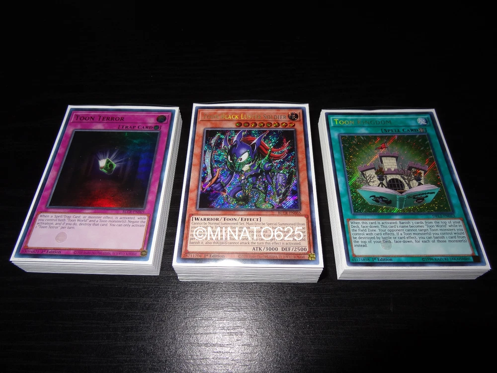 - Item for sale is a Complete 40 Card Toon Deck - Ultra Pro sleeves + deck box included - Please leave a checkout note or message me your color choices (randomly chosen otherwise) 40 CARD TOON DECK: Extra Deck Monsters (15): 3x Red-Eyes Flare Metal Dragon (Ultra Rare) 1x Cyber Slash Harpie Lady (Secret Rare) 1x Chimeratech Megafleet Dragon (Ultra Rare) 1x Number 38: Hope Harbinger Dragon Titanic Galaxy (Ultra Rare) 1x Number 41: Bagooska the Terribly Tired Tapir (Rare) 1x Accesscode Talker (Ultra Rare) 1x Mekk-Knight Crusadia Avramax (Secret Rare) 1x Underworld Goddess of the Closed World (Secret Rare) 1x Selene, Queen of the Master Magicians (Secret Rare) 1x Hieratic Seal of the Heavenly Spheres (Ultra Rare) 1x Knightmare Unicorn (Ultra Rare) 1x I:P Masquerena (Ultra Rare) 1x Barricadeborg Blocker Monster Cards (19): 3x Toon Black Luster Soldier (Secret Rare) 1x Red-Eyes Toon Dragon (Super Rare) 1x Toon Dark Magician (Super Rare) 1x Toon Dark Magician Girl (Ultra Rare) 3x Toon Harpie Lady (Super Rare) 1x Toon Ancient Gear Golem (Super Rare) 1x Blue-Eyes Toon Dragon 1x Toon Summoned Skull (Rare) 1x Toon Cyber Dragon 1x Toon Gemini Elf 1x Toon Goblin Attack Force 1x Toon Cannon Soldier 1x Toon Masked Sorcerer 1x Toon Mermaid 1x The Black Stone of Legend (Ultra Rare) Spell Cards (18): 3x Toon Kingdom (Secret Prismatic Rare) 3x Pot of Extravagance (Ultra Rare) 3x Toon Table of Contents (Super Rare) 3x Toon Bookmark (Secret Rare) 3x Toon Page-Flip (Secret Rare) 1x Comic Hand (Ultra Rare) 1x One for One (Super Rare) 1x Terraforming (Rare) Trap Cards (3): 3x Toon Terror (Ultra Rare) Shipping - All orders will be shipped with bubble mailer and a protective case. - All Orders will be shipped off within 1 day of purchase - Orders placed on Saturday and Sunday will be shipped off the following Monday. - All orders will be shipped with Free First Class Shipping (3-5 days) + Tracking! - Priority Mail (1-3 days) and Priority Mail Express (1-2 days) are available as well, shipping price will vary depending on your destination. - I ship to both Domestic (U.S.) and International destinations! Payment - Please pay within 3 days of your order to avoid an Unpaid Item Case. This just helps me run things smoothly for other bidders/buyers and myself. Will appreciate if you please leave feedback when you receive your item, and I will leave feedback as well. Contact me if anything is wrong with your order so I can have a chance to fix the issue- Your satisfaction is most important! Thank You! - If you have any questions please do not hesitate to contact me and I will respond as soon as possible. Thank you for taking a look. Have a Great Day!