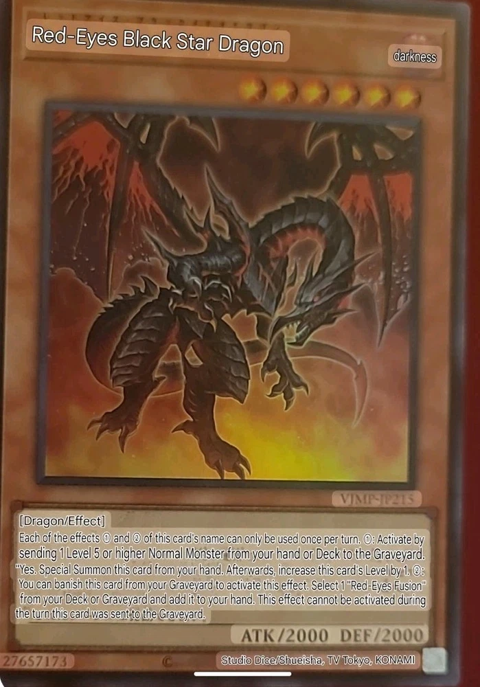 This is the "Red-Eyes Black Meteor Dragon" aka "Red-Eyes Black Star Dragon" from the Japanese V Jump manga anthology. Condition: Near Mint. See images for exact condition. Card will be shipped in a penny sleeve and toploader in an eBay Standard Envelope. Description on the card from Google Translate (a screenshot is also included in the images): "Dark [Dragon/Effect] Each of the effects ① and ② of this card's name can only be used once per turn. ①: Activate by sending 1 Level 5 or higher Normal Monster from your hand or Deck to the Graveyard. You can Special Summon this card from your hand. Afterward, increase this card's Level by 1.②: Activate by banishing this card from the Graveyard. Select 1 'Red-Eyes Fusion' from your Deck or Graveyard and add it to your hand. This effect cannot be activated on the turn this card was sent to the Graveyard."