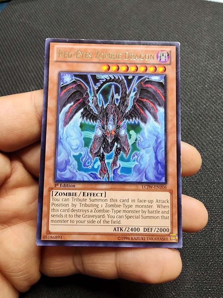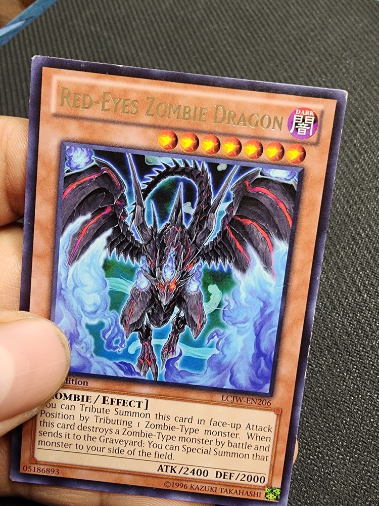 Red-eyes zombie dragon Card rarity- Rare Card set- LCJW-EN206/ 1st Edition Card condition- mod play/light played. Card has some waxing and scratching on back. Some whiting around edges/ corners. Condition shown in pictures as best as possible. **All Cards are sent in a top loader and sleeve, Thanks for looking** ***shipping*** ** Most cards are sent out the next day, or if purchased on the weekend, they are sent out first thing Monday. ***Holiday purchases cards will go out, the day after the holiday is over***. Thanks for looking!!**