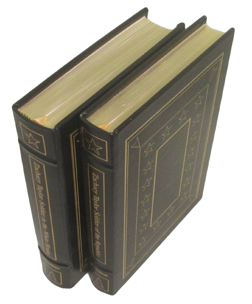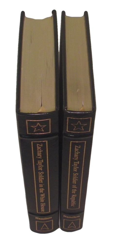 Zachary Taylor Soldier of the Republic – Soldier in the White House Two volume set Holman Hamilton Easton Press 1989 library of the president’s Full Leather - 22K Gold Page Edges and Graphics - Sewn Binding - Acid Free Paper - Raised Bands on Spine - Illustrated End Papers - Sewn in Ribbon Page Marker _____________________________________________ Taylor fought in four wars and was a distinguished hero in all of them. “Old rough and ready” as he was affectionately called by his men, was first and foremost a soldier in the service of this country. Although lacking the genius and appeal of many of his contemporaries…
