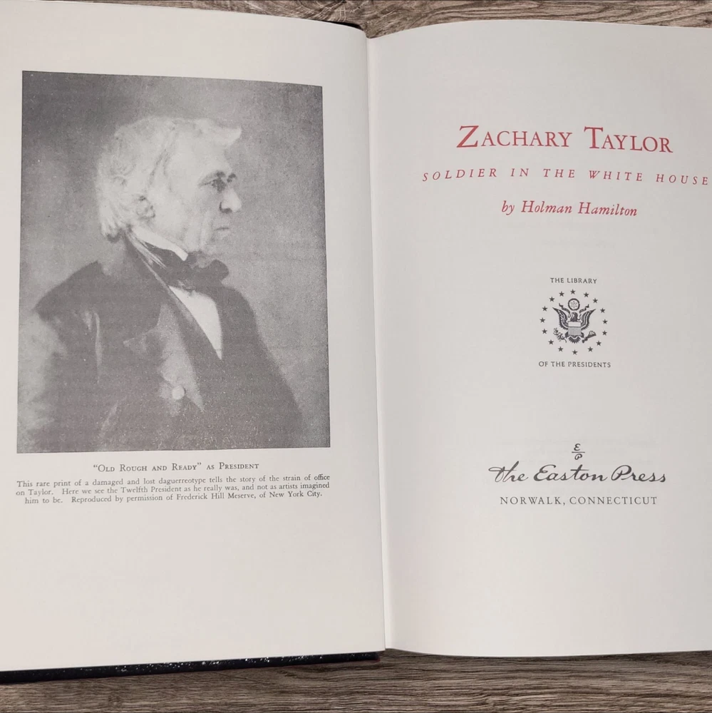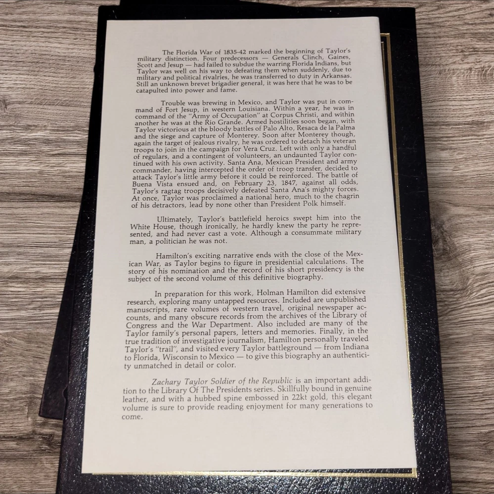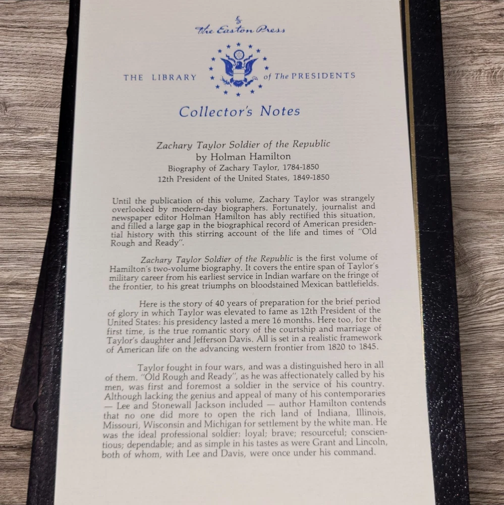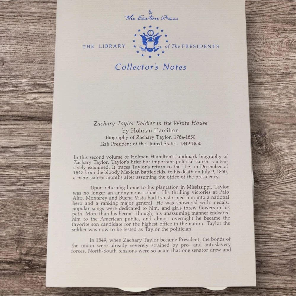 Set of 2 Collectors edition books, Zachary Taylor Soldier of the Republic and Soldier in the White House. Both written by Holman Hamilton. This 2 volume set was printed in 1989 from Easton Press. Original publication dates are 1941 and 1951 respectively. Both include original leaflet, "Collector's Notes." Books will be well packed in a box for shipping.