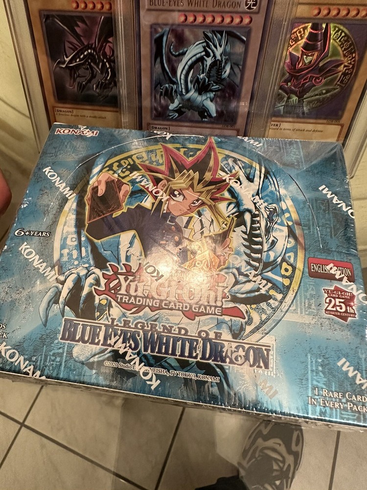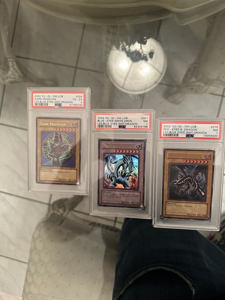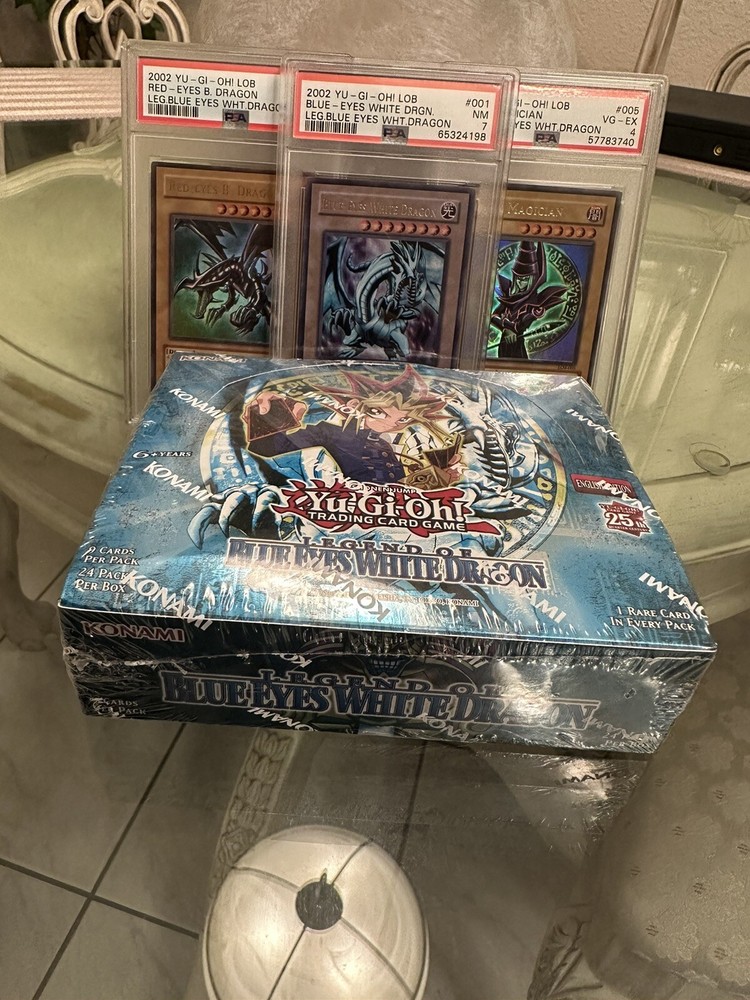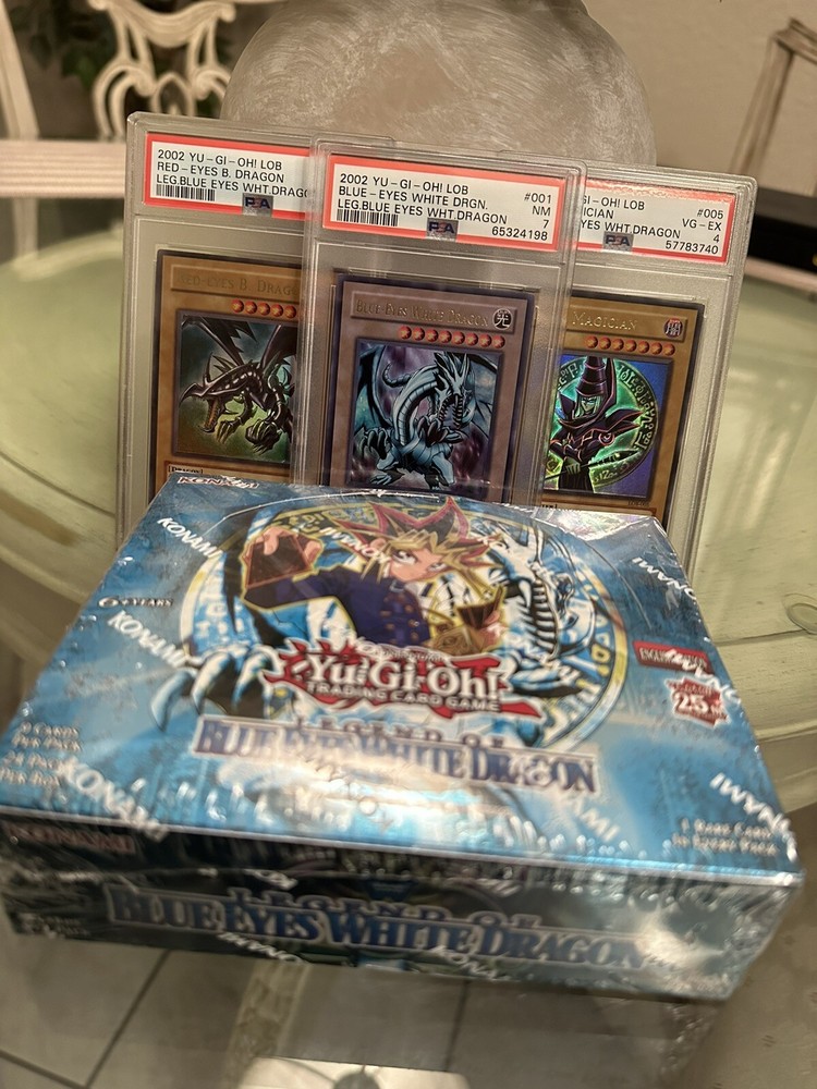 Psa 7 blue eyes white dragon Lob 2002 unlimited Psa 7 red eyes black dragon Lob 2002 unlimited Psa 4 dark magician Lob 2002 unlimited Yugioh first set English unlimited Also will include a sealed Blue eyes white dragon 25th anniversary booster box (24 packs)