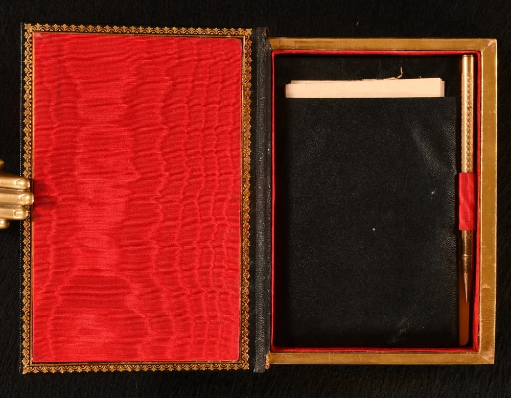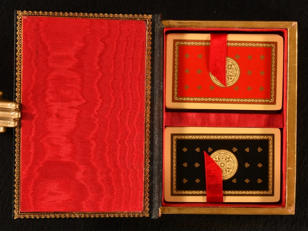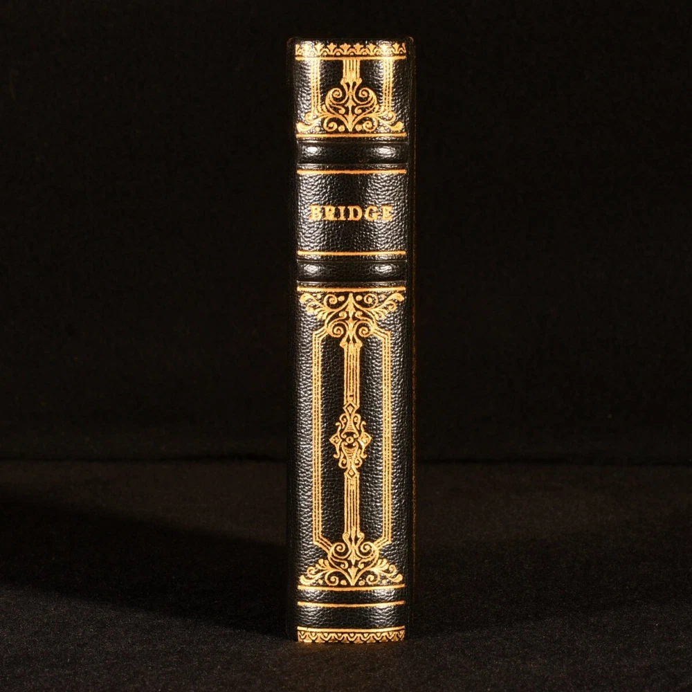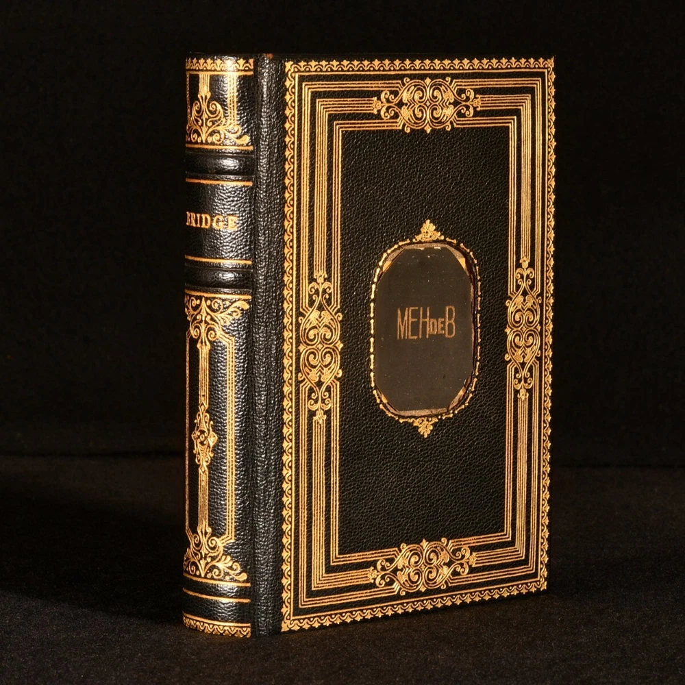Click here to see our other books! Bridge Game Set None c1930 None : None 6" by 4.5" Unpaginated SUMMARY A smart and unique compact set of Bridge, containing two complete decks of cards, blank scoring sheets, and a pencil. Leather Binding,Very Scarce Overall Condition: Near Fine This book weighs 0.5 KG when packed UK Postage: £ 3.99 US Postage: £ 15.99 EU Postage : £ 13.99 European Postage: £ 14.99 Asia Postage: £ 18.99 Worldwide Postage: £ 19.99 DESCRIPTION A very smart bridge game set in a morocco clamshell box, containing two complete sets of playing cards, one red and one black, alongside a pouch which contains a pencil and twenty-three blank scoring sheets. This compact box would have been ideal for playing the game on the go. Gilt initials 'M. E. H. de B.' to the front board, being M. E. H. de Bruyne. Bridge, as it is played now, was evolved from the game of whist in the nineteenth century, the first rule book for the game being published in 1886. The modern game of contract bridge developed partly due to innovations of Harold Stirling Vanderbilt, a champion player of the illustratious family. CONDITION In a full morocco clamshell case. Externally, smart, with very light rubbing to the joints, and one small mark to the tail of the rear board. The pouch has a few light marks. The one-hundred and four playing cards are bright and clean. Overall Condition: Near Fine GLOSSARY OF TERMS Overall Condition (Dustwrapper condition rating is shown after that for the book itself, where a dustwrapper is present) Fine - Very well preserved copy showing very little wear Very Good Indeed - Only one or two minor faults, really a very attractive copy Very Good - Quite a wide term meaning no major faults but probably several smaller ones often expected given the age of the book, but still a respectable copy Good - Meaning not very good. Some more serious faults as will be described in the condition report under 'condition' Good Only - Meaning one or more faults that could really do with repair Fair - As with good only above but with other faults leaving a compromised copy even after repair Poor - Really bad and possibly seriously incomplete. We only sell books in this condition where their rarity or value makes them attractive none the less. Major defects will be described. GUARANTEE We offer a full money back guarantee on our descriptions. Please ask for details and conditions. We prefer PAYPAL. If you pay via PAYPAL we will post the item off the same or the next working day with the postage you have selected. Please note we cannot accept USD cheques