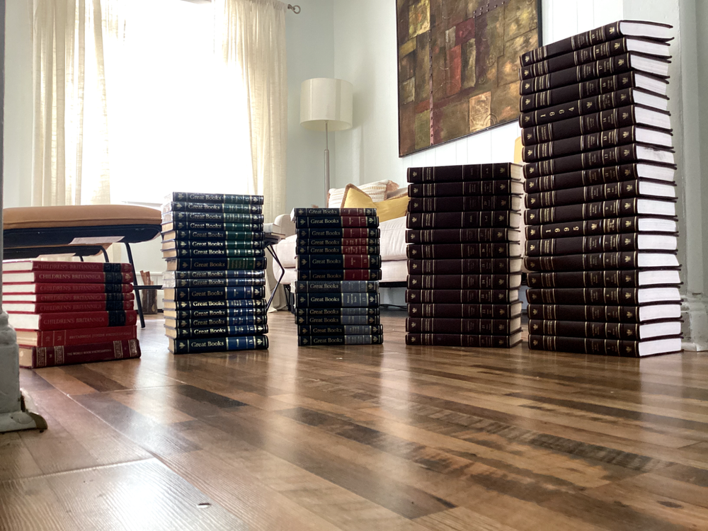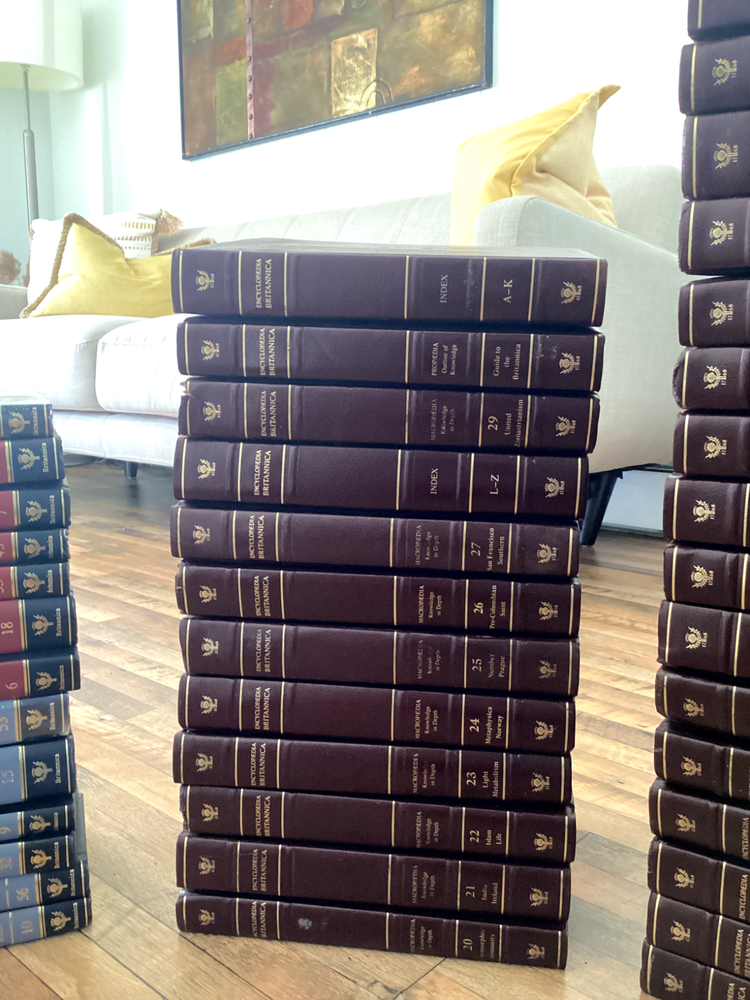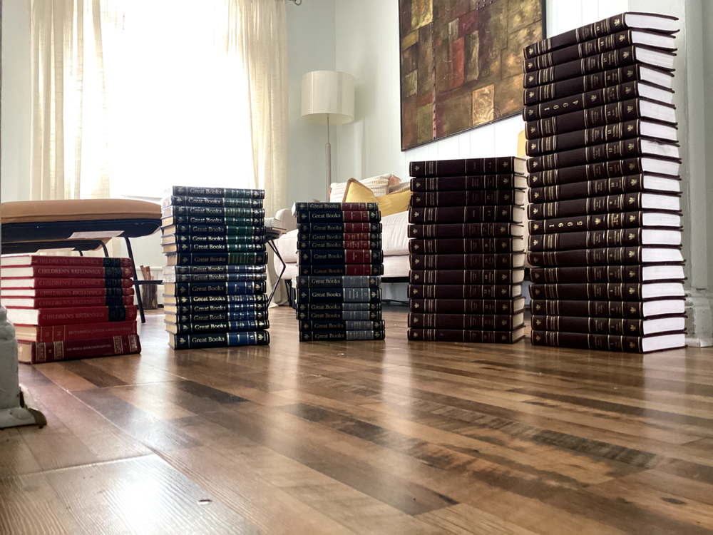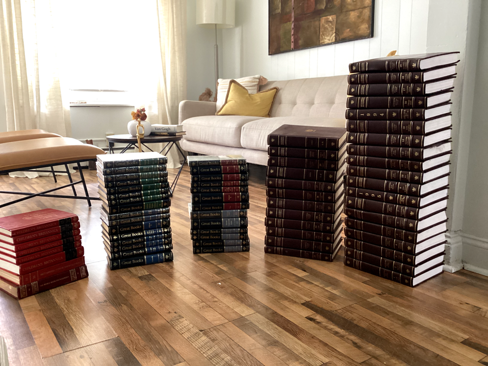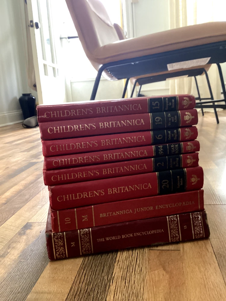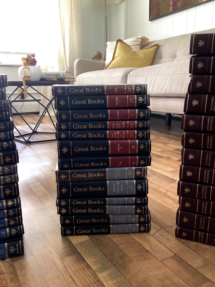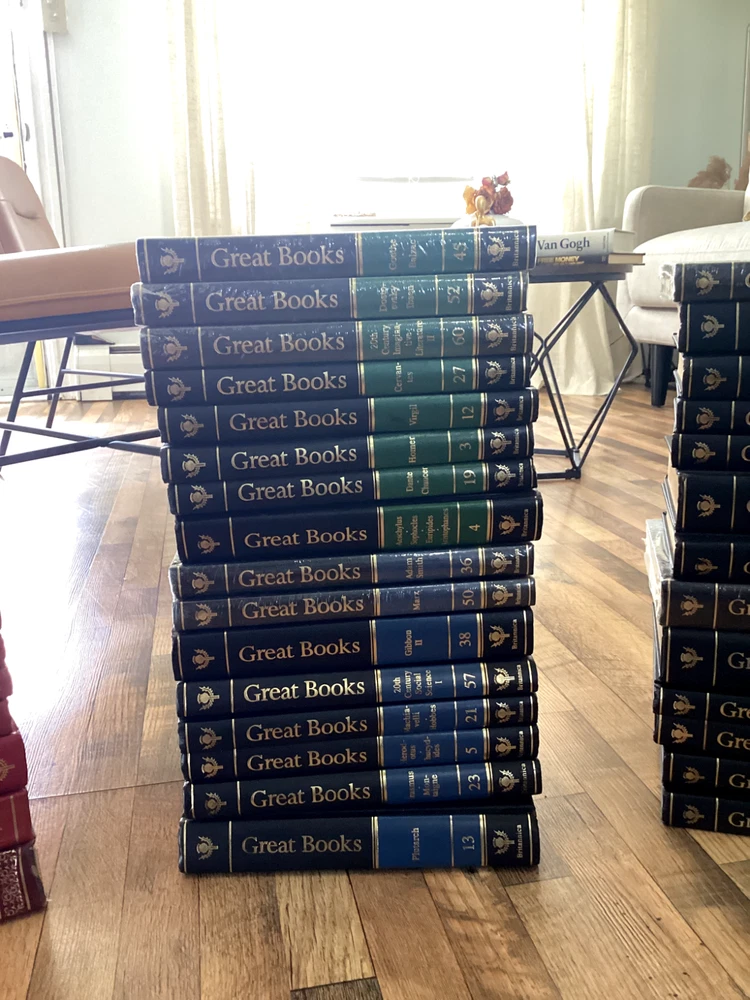 The Encyclopaedia Britannica set is nearly complete, with two volumes having defects, but the rest are in good condition, preserved in mid-condition. The Great Books collection is in good condition, with some volumes still sealed in plastic and untouched. The Children's Britannica is also in mid-condition. I'm looking to just get them off my hands.