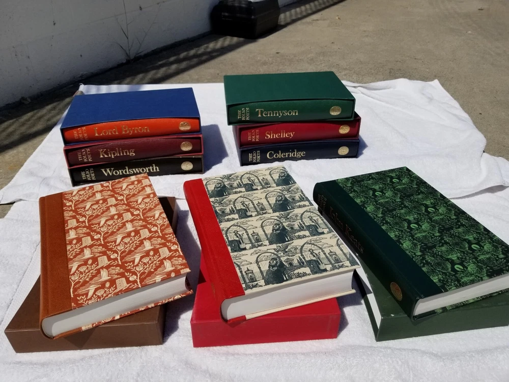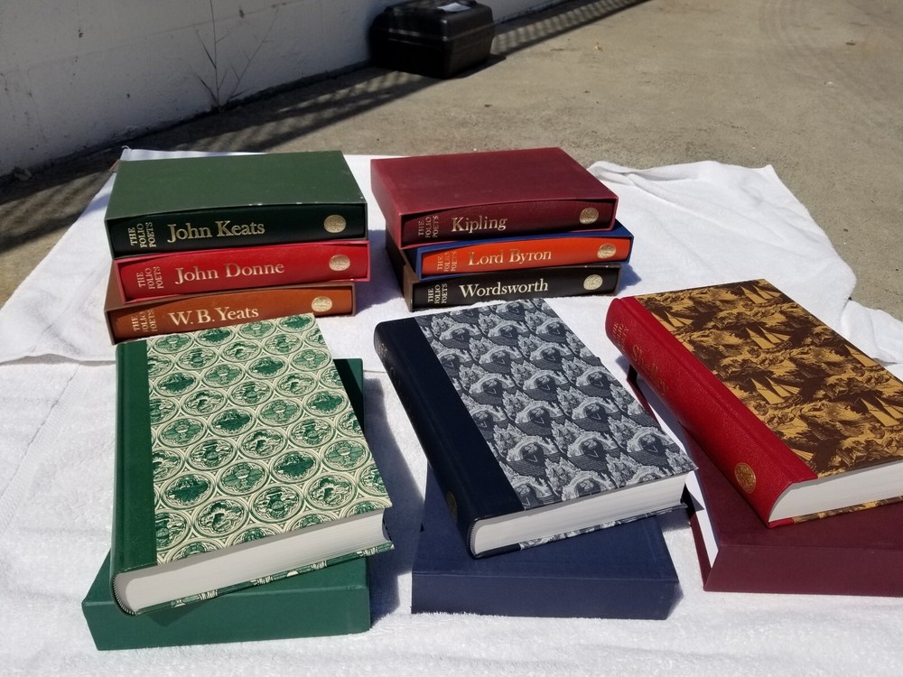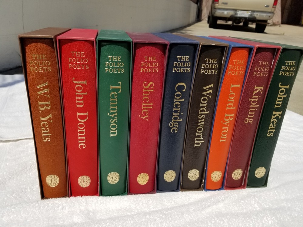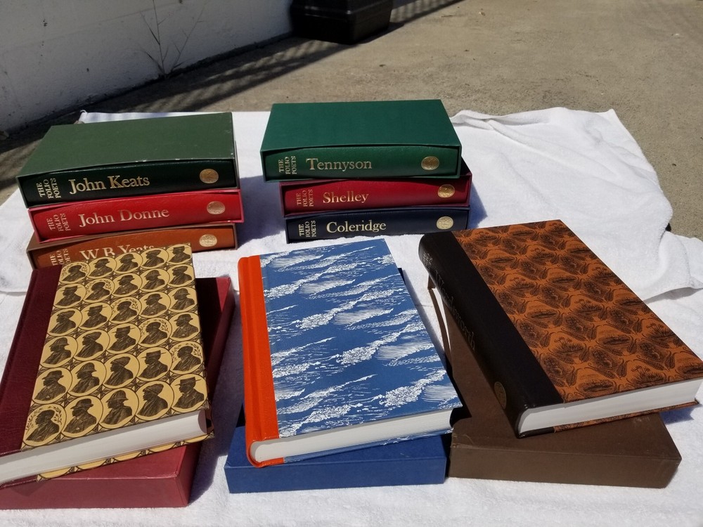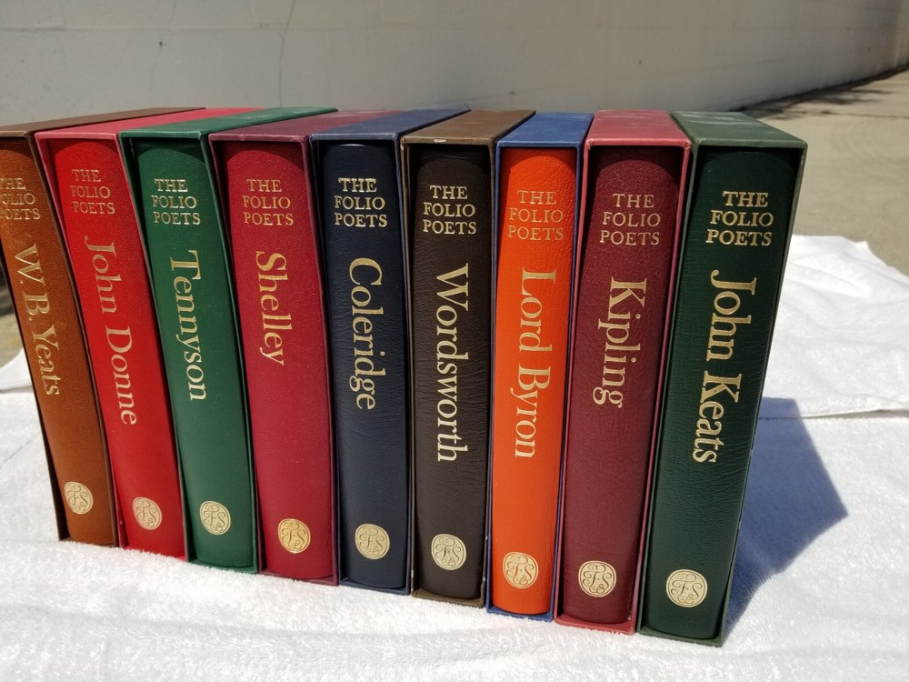 presented here is the complete nine-volume set of the folio society poets series, each volume is in mint condition and has been lovingly kept in a smoke-free home. i have never seen the entire set offered complete with all nine volumes, so i have declined various offers i've received for individual volumes. but i will consider reasonable offers for the set. each volume is extensively illustrated and beautifully produced, with high quality printing on thick paper. they are oversized with quarter-leather bindings, and each has its original individual slipcase. for a lover of poetry, these volumes are unsurpassed. note: 50% of all net proceeds go to united 24 to support the defense of ukraine, and the other 50% of all net proceeds go to direct relief for families and friends living and struggling now inside ukraine. thank you and slava ukraini!