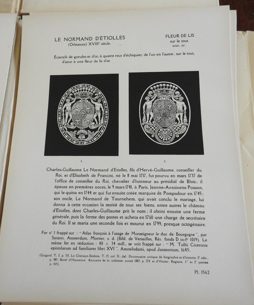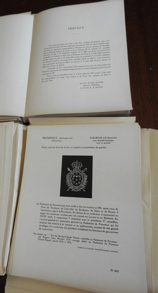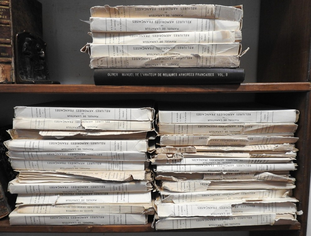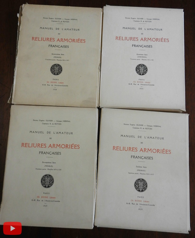 rare French armorial leather book bindings 1925 Olivier 30 vol. set 2685 plates rare French armorial leather book bindings 1925 Olivier 30 vol. set 2685 plates (Old Books, Early 20th Century Books, Illustrated Books, French Books, French Armorial Bindings, Book Collecting). Click here to view a short video presentation. Short video captures condition much better than photos. Please watch prior to purchase to ensure a full understanding of the set. Manuel de L'Amateur de Reliures Armoriees Francaises, by Eugene Olivier. Published 1925-34, Paris by Bosse. 30 volumes [29 orig. fascicules, one hardbound number]. A rare complete run of this essential and monumental bibliographic reference, with 2,685 plates showing specific individual book binding cover gilt stamps which identify the owner of the binding design. Published over a period of years, making complete sets uncommon. Publisher's card stock paper wrappers, each fascicule with flap which open to contain the stack of loose pictorial text sheets as issued. Set is physically old and shows some signs of handling and time. Set is not new or in "new" condition. Bindings gently age worn, various spines with tears, paper flaws, set remains overall attractive as an object. Text block paper is gently toned, but internally paper and sheets remain clean, fresh, well preserved, complete. Still attractive on the shelf. Set displays a pleasing and unique age patina and is in nice antiquarian condition, any age flaws easy to overlook or forgive. Please review photos for more detail and our best attempt to convey how this monumental reference set survives. Still useful today. Books Measure c. 11 3/4" H x 8 3/4" W. A very large heavy set, will likely require 2 heavy boxes for mailing it. [B2770-BR1224].