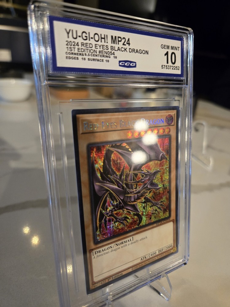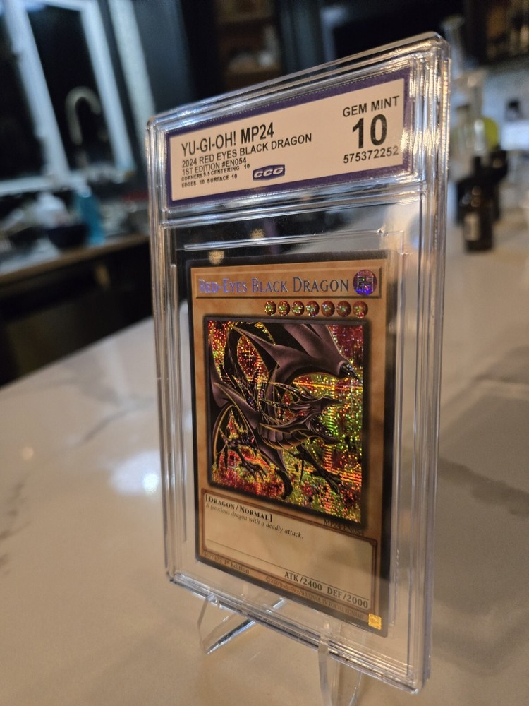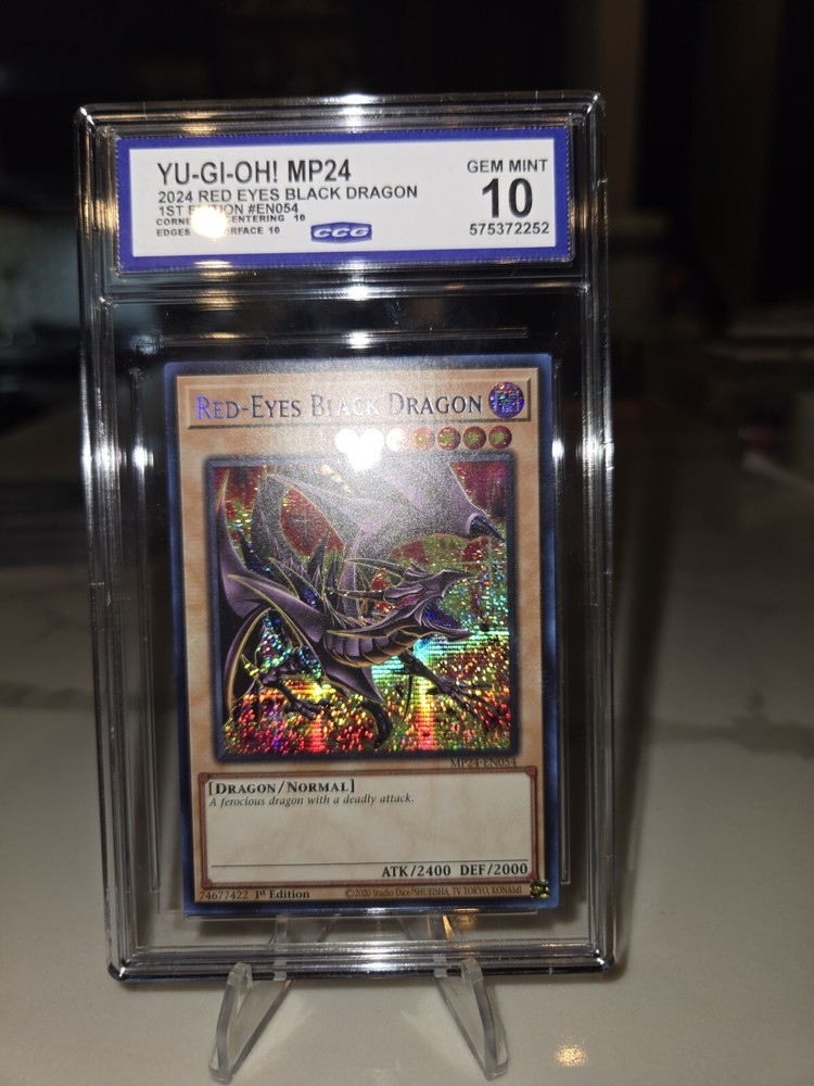 This is a rare and highly sought-after card, featuring the iconic Red Eyes Black Dragon creature from the Yu-Gi-Oh! TCG game. It boasts a Prismatic Secret Rare rarity, with a stunning Foil finish that is sure to impress collectors. The card is graded GEM MINT 10, ensuring its quality and authenticity. This 1st Edition card is a must-have for any serious collector, with its unique features and impressive year of manufacture in 2024. Its card number is MP24-EN054, making it a valuable addition to any collection. Don't miss out on the opportunity to own this rare and coveted card!