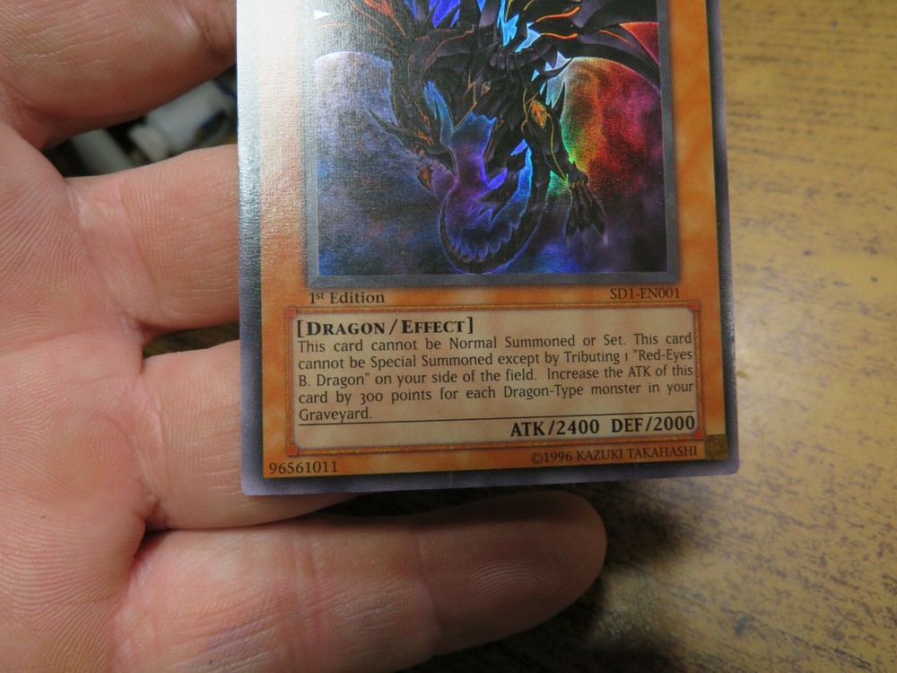 Please read this in its entirety before bidding. This auction is for red eyes darkness dragon sd1-en001 1st edition holo yugioh card Some states have begun charging tax to online sellers if you are in one of these states Ebay may add sales tax to your purchase. We have nothing to do with this. We do not get the money. Check out the pictures for a better look at what you are bidding on. WE have a 4 working day handling time on all items. This means up to a 6 day wait before your item ships after payment is received. Shipping Limited only to the continental 48 States will be $4 .00 Local pick up is not available, we do not ship to APO, or other forwarding services unless you are approved by message. Items are described to the best of my abilities, please use the pictures to better help you understand what you are bidding on. If its not in the Pictures its not included. Any questions or comments regarding item must be made thru Ebay, I will not answer any messages sent thru other channels. Please give me 24hrs to answer before you wig-out. If you don't receive an answer before the auction ends don't assume you know the answer. If you don't understand something, get an answer before you bid. All items are generally sold as-is, On Items that an inspection period is offered, you will be required to return the item for a full refund. I do not issue partial refunds, and let people keep the items. Texas Buyers Pay 8.25% Sales Tax