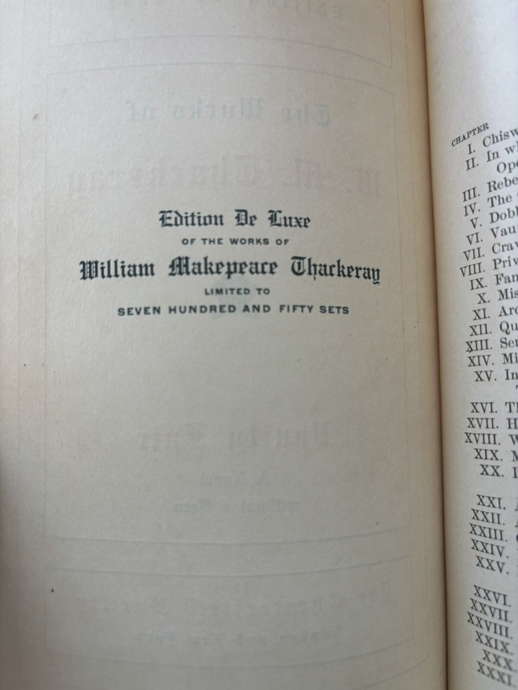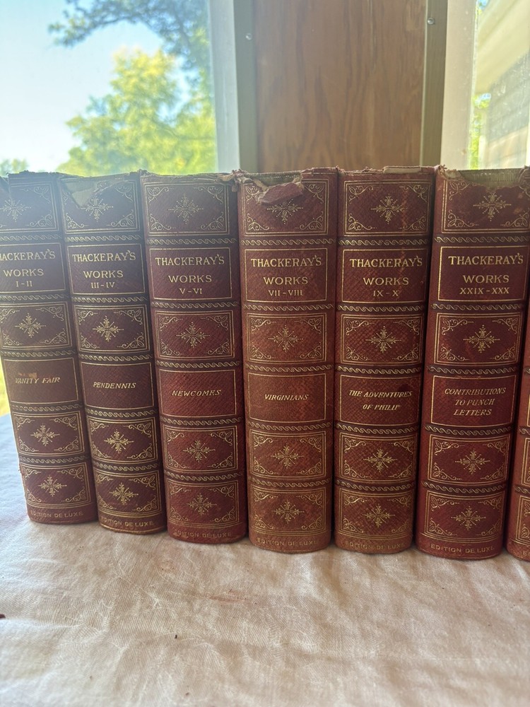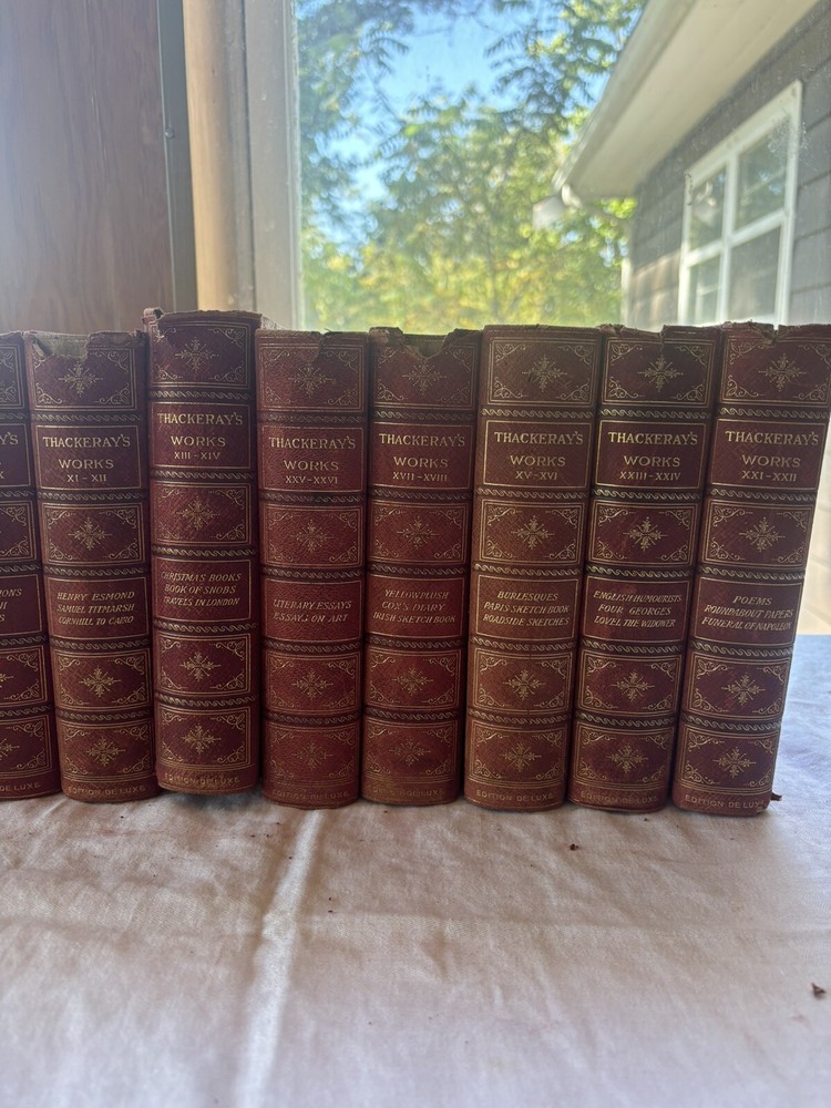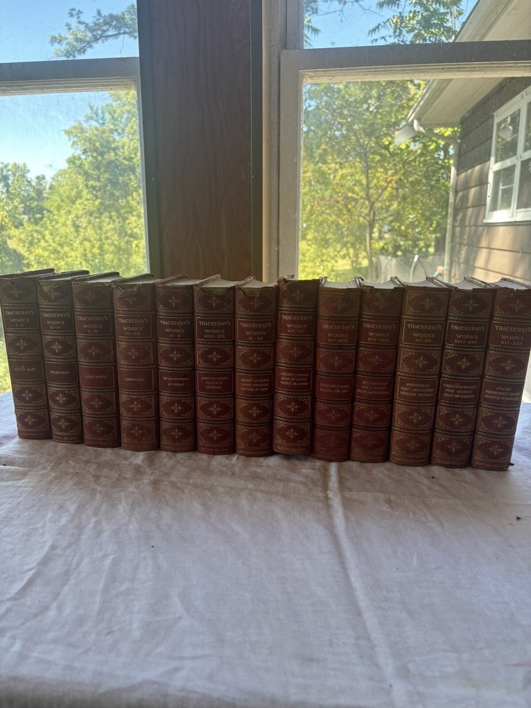 The complete works of William Thackeray in thirteen volumes. Illustrated, with a frontispiece to all volumes. Volume XIII, The Christmas Books has a total of 73 plates, including the frontispiece. The volumes are as follows: Volume I : Vanity Fair Volume II: The History of Pendennis Volume III : The Newcomes Volume IV: The History of Henry Esmond and The Memoirs of Barry Lyndon Volume V: The Virginians A Tale of The Last Century Volume VI: The Adventures of Philip on His Way Through The World Volume VII: The Paris Sketch Book, The Irish Sketch Book and Notes of a Journey From Cornhill to Grand Cairo Volume VIII: The History of Samuel Titmarsh and the Great Hoggarty Diamond; Memoirs of Mr C J Yellowplush; And Burlesques Volume IX: The Books of Snobs, Sketches of Life and Character etc Volume X: Roundabout Papers, The Four Georges, The English Humourists, The Second Funeral of Napoleon Volume XI: Catherine, Lovel the Widower, Denis Duval, Ballads etc. Volume XII: Miscellaneous Essays, Sketches and Reviews, Contributions to Punch. Volume XIII: The Christmas Books of Mr M A Titmarsh Collated, complete. William Makepeace Thackeray was famous for his satirical works. Vanity Fair brought Thackeray his fame and is a panoramic portrait of English society. His earliest works were written under pseudonyms such as Charles James Yellowplush, Michael Angelo Titmarsh and George Savage Fitz-Boodle. His parodies and satire tended towards attacks on high society, military prowess, the institution of marriage and hypocrisy. During the Victorian era Thackeray was ranked second only to Charles Dickens.