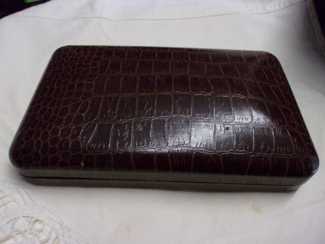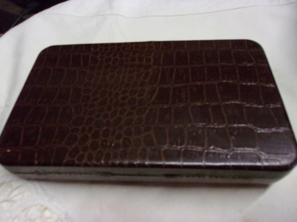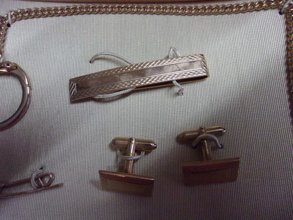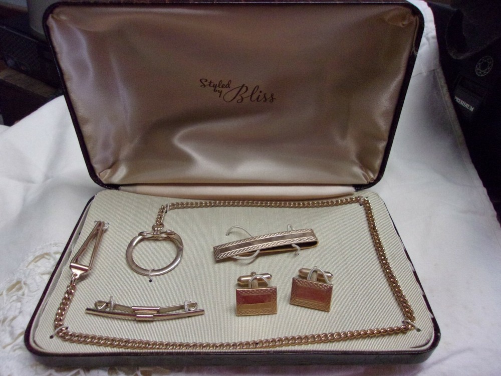 HANDSOME VINTAGE GENTLEMENS JEWELRY 4 PIECE MATCHED SET IN ORIGINAL LEATHER BOUND CASE. STYLED BY BLISS. BEAUTIFULLY CRAFTED JEWELRY MATCHED SET. VEST WATCH CHAIN. CUFF LINKS, COLLAR TIE. TIE BAR OR MONEY CLIP, PLUS THE CASE.. SEE THE PHOTOS FOR YOUR BEST DESCRIPTION. I SEE NO MARKINGS OF MANUFACTURER. . MAYBE YOU KNOW. GUARANTEED AND I SHIP FAST. LOOKS TO BE IN BEAUTIFUL CONDITION. I HIP IN ONE DAY. YOU HAVE IT IN 2-3 DAYS USPS PRIORITY MAIL.
