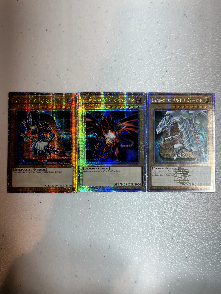 This Yugioh Quarter Century set is a must-have for collectors! The Blue-Eyes White Dragon, Dark Magician, and Red-Eyes Black Dragon look stunning with their premium foil finish. The cards arrived in perfect condition, just like the photos. Highly recommended for any fan of the classic series!